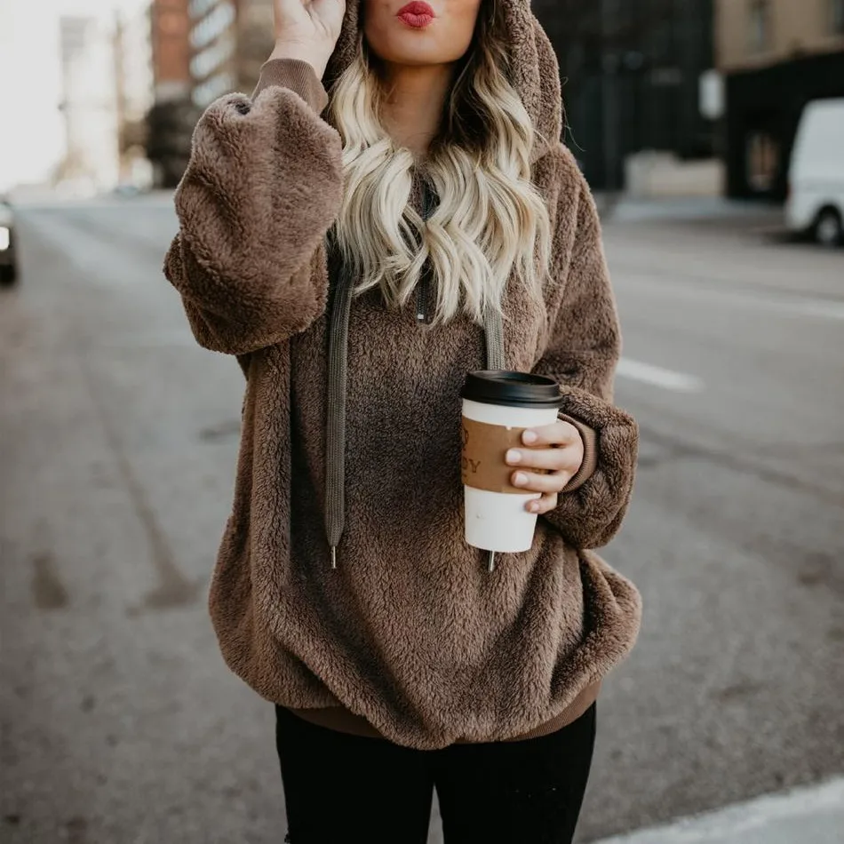 Женская плюшевая толстовка с капюшоном, с длинным рукавом и карманами