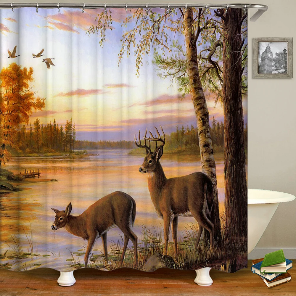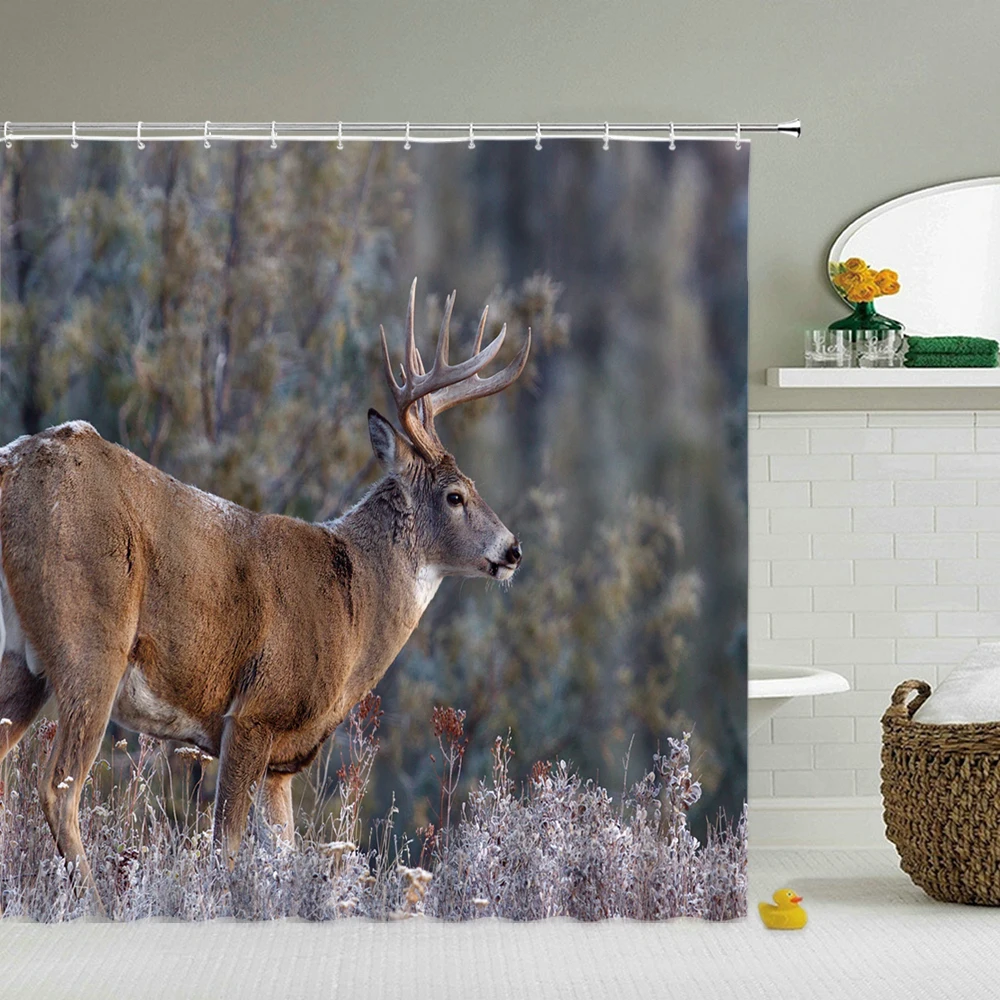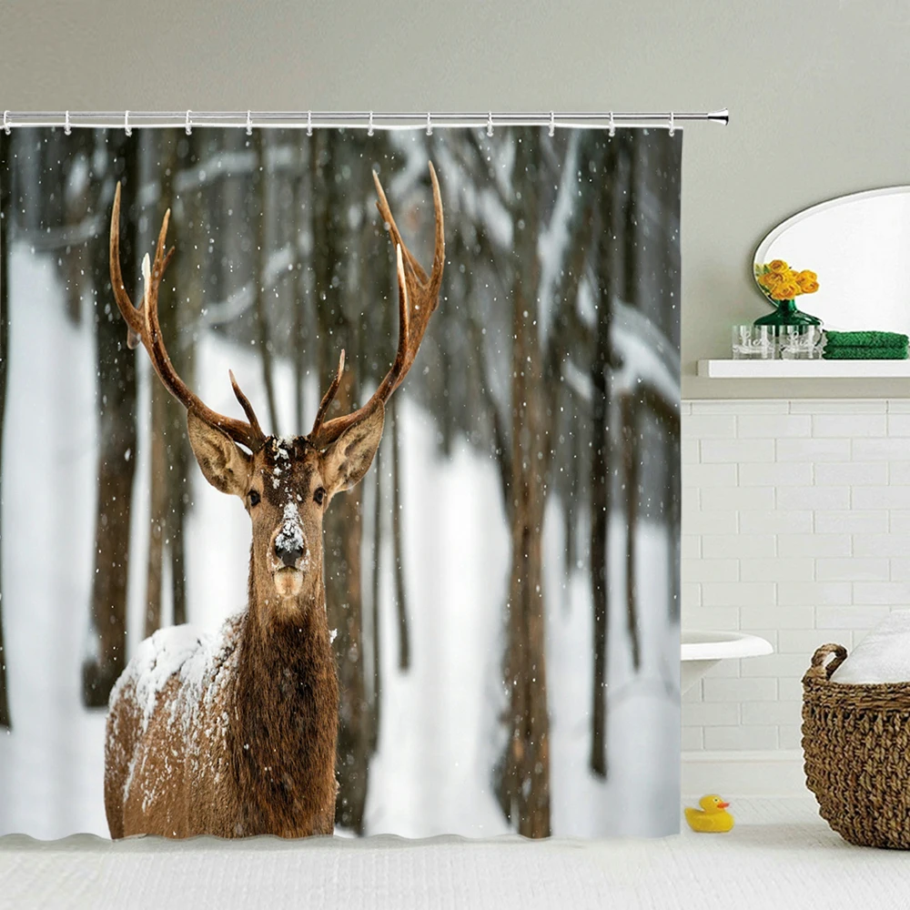Шторы для душа с оленями и крючками, водонепроницаемые 3d занавески в ванную комнату с рисунком лося, моющиеся, с рисунком