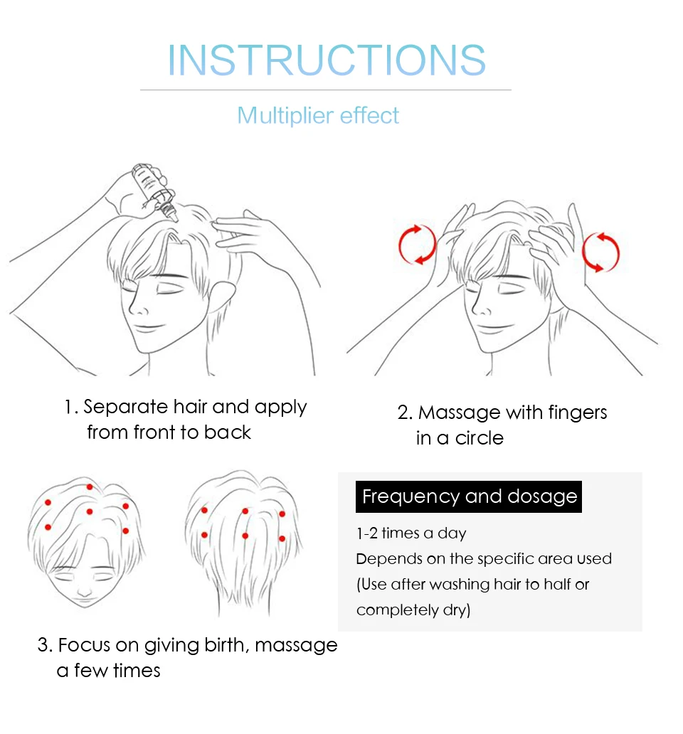 Бренд: HAIRCUBEЖидкость для роста волосМетод:Используйте два раза в день. Для достижения лучшего эффекта Используйте 1 мл спрея (около 4-5 спреев)Непосредственно на части волос, что помогает росту волос. Увеличение времени использования или количестваНе оказывает лучшего эффекта. Используйте согласно инструкции, каждая бутылка используется для использует d дляМинимум 25- -30 дней, что может эффективно уменьшить выпадение и поломку волос.Руководство по использованию 1:Дважды в день, обычно утром и вечером, с интервалом более 6 часов.Убедитесь, что ваши волосы и кожа головы полностью сухие в использовании.1. На участке волос разделите волосы на один или несколько рядов.2. Несколько раз встряхните бутылку и распылите прямо на корни волос.3. Аккуратно помассируйте пальцами, чтобы волосы впитывались, а затем тщательно Вымойте руки.4. Если спрей контактирует с теплой кожей, сначала промойте пальцы холодной водой.Ночью Следуйте вышеуказанным шагам и используйте правильно. Убедитесь, что у вас достаточно времениПолностью высохнуть перед сномВнимание:1. Не используйте, если повреждена, повреждена или инфицирована кожа головы.2. Избегайте попадания в глаза. Если он случайно попал в глаза, промойте его водойAtely.3. Если есть дискомфорт при использовании этого продукта, рекомендуется прекратить его использование imme-Diately.4. Этот товар следует хранить в прохладном темном месте.5. Запрещено детям и беременным женщинам.