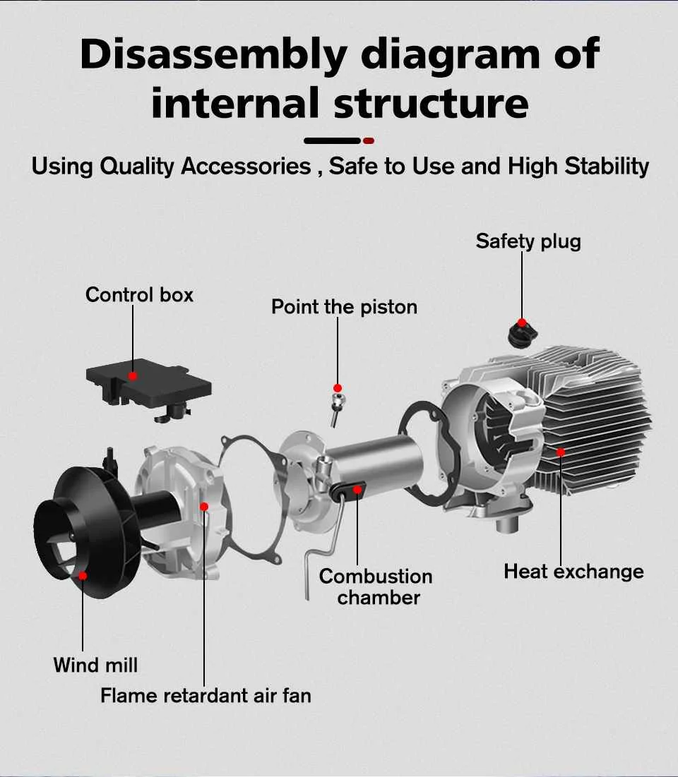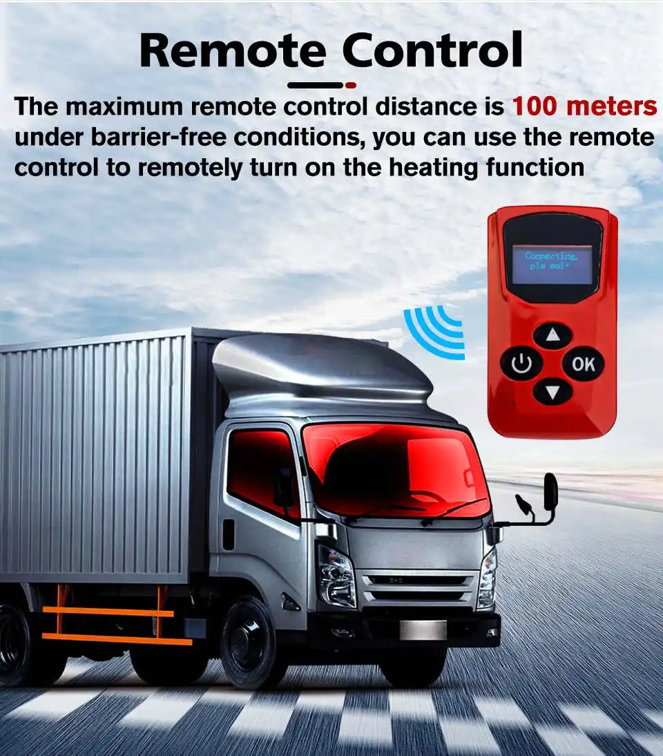 Характеристики:Переключатель:ЖК-ручка с цифровой индикациейМощность нагревателя:2 кВтТопливный бензин: дизельНоминальное напряжение:12 ВРасход топлива: 0,2-0,5Рабочая температура нагревателя:-40 ℃ ~ + 50 ℃Рабочая температура масляного насоса:-40 ℃ ~ + 40 ℃Диапазон рабочего напряжения: 10-12/20-32Вес изделия: 4230 гВес брутто: 8450 гРазмер изделия:34*11*11Расстояние дистанционного управления: 100 метровОсобенности:?Может использоваться на больших высотах, 4500 метров над уровнем моря.?Нагреватель может быть применен для обогрева кабины грузовых автомобилей,-, аккумуляторные батареи автомобилей и всех видов других транспортных средств.?Может устранить Мороз окна;?Экологически чистый продукт, Низкий уровень выбросов, низкий расход топлива; Выхлопные газы нагревателя для удовлетворения евро IV требований к выбросам двигателя.?Компактная конструкция,Простота установки;?Может демонтировать новый автомобиль при замене транспортного средства.?Летучая технология, С помощью керамической вилки зажигания нагрев топлива испарится в газ, быстрое зажигание, полное сгорание.?ИспользованиеУсовершенствованная технология автоматического управления, С надежными ненормальными условиями эксплуатации.?Нагреватель может быть кодированДистанционный пульт.?Топливо, электричество, температура может быть установлена произвольно.?Можно использовать дизельное топливоВ комплект входит:1 xГлушитель1 xЖК-дисплей термостат1 пульт дистанционного управления1 x парковочный обогреватель1 х комплект основной проводки1 x 5л масляный насос1 x Соединительный провод масляного насоса1 x фильтр1 х масляная труба1 х переключатель управления1 x впускная воздушная труба1 х выхлопная труба1 х прокладка1 x уменьшенная футболка2 x терминал1 x зажим масляного насоса1 x зажим для Впускной воздушной трубы1 x зажим выхлопной трубы2 x крепежный зажим для Впускной воздушной трубы2 x крепежный зажим для выхлопной трубы6 х соединительных труб для масла12 x зажим для масляных труб4 шайбы4 x гайка6 x само сверлящийся винт стук4 х саморезы10 x нейлоновые кабельные стяжки1 х трубка всасывания масла1 x Воздушный Впускной колпачок1 х глушитель