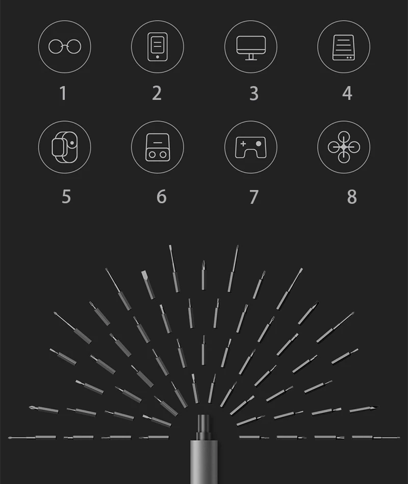 Серийная модель и область примененияCross bit (PH0000 cross 1,2, PH000-cross 1,5, PH00-cross 2,0, PH0-cross 2,5, PH1-cross 3,0, PH2-cross 3,5)Широкий спектр применения, демонтаж большинства бытовых приборов;Y Тип головки партии (Y0.6, Y1, Y2.0, Y2.5, Y3.0)Разборка и сборка игровых консолей (GB, GBA, NSDL, WII), Y0.6 split IPHONE7/-PUS/ Apple Watch, Y2.0Y2.5 разделил некоторые небольшие устройства;Заголовок одного слова (SL1.0, SL1.5, SL2.0, SL2.5, SL3.0, SL3.5, SL4)Обычно используемые бытовые головки, подходят для прецизионных инструментов, съемные винты для очков SL1.0;Шестигранная розетка (H0.7, H0.9, H1.3, H1.5, H2.0, H2.5, H3.0, H4.0)Снос дронов, снос моделей, двигателей, оружия, ножей, велосипедов и т. Д.;Партия Т-типа (T2, T3, T4, T5, T6, T7, T8, T9, T11, T15, T20)Может использоваться для разборки мобильных телефонов, ноутбуков, жестких дисков, компьютеров, геймпадов и ножей;Пятиконечная партия головок (P2-☆ 0,8, P5-☆ 1,2, P6-☆ 1,5)Удалите телефон/компьютер Apple;Квадратная партия (S0, S1, S2)Подходит для винтов с квадратной головкой;▲ Тип головки ротора (▲ 2,0, ▲ 2,3, ▲ 2,5, ▲ 3,0)Используется для небольших бытовых приборов, в основном для внутренних треугольных винтов;Серия типа U (U2.0, U2.6, U3.0)Разобрать необходимые электрические продукты, такие как доска;С помощью иглы (0,8), чтобы взять карты;W1.5Снимите Мобильный телефон Apple 6S и выше;4 удлиненные 45 мм головки партии (PH0, PH2, SL2.0, H2.0)Подходит для глубоких винты для отверстий, высокая доступность;