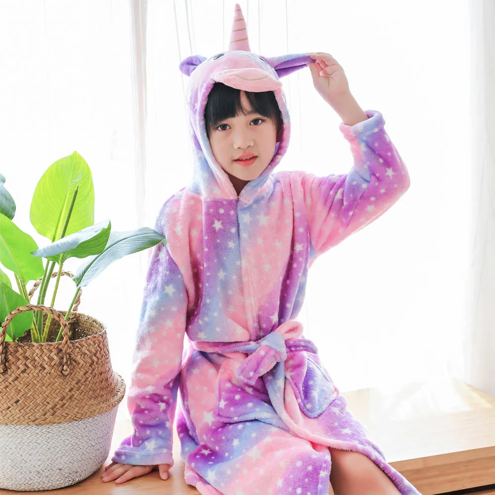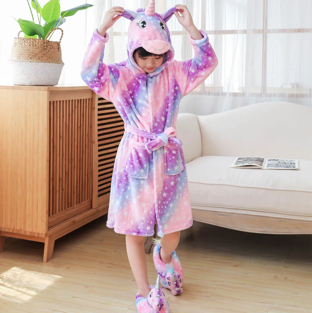 Халат для девочек, на возраст 4, 6, 8, 10, 12 лет, банный халат с единорогом, зимний, теплый, фиолетовый, Радужный, с капюшоном, пижамы для дня рождения