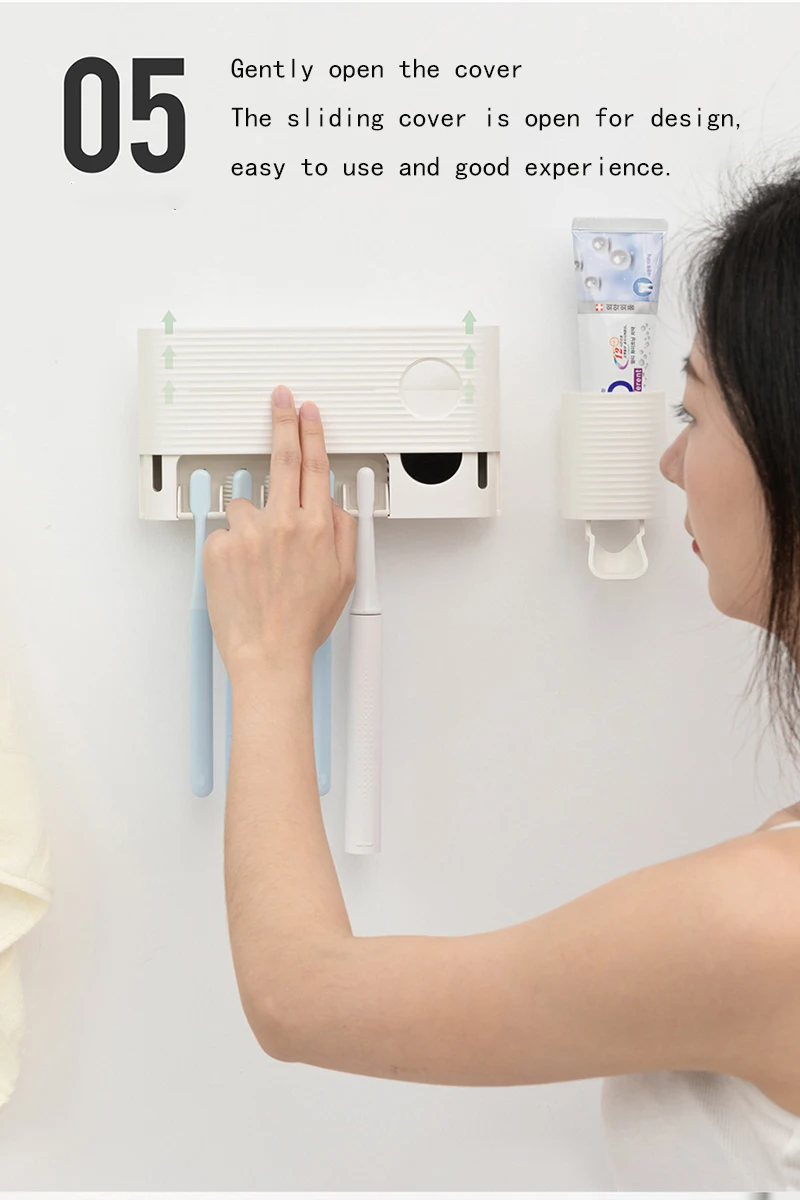 ОписаниеXiaomi УФ-свет зубная щетка стерилизатор держатель Дырокол бесплатно ингибит бактериальная зубная щетка Антибактериальный ящик Автоматический Дозатор зубной пасты-Дизайн включает в себя классическую эстетику и элегантность вентилятора, а также приятный на ощупь.-АБС-пластик, приятный на ощупь, устойчив к падению
