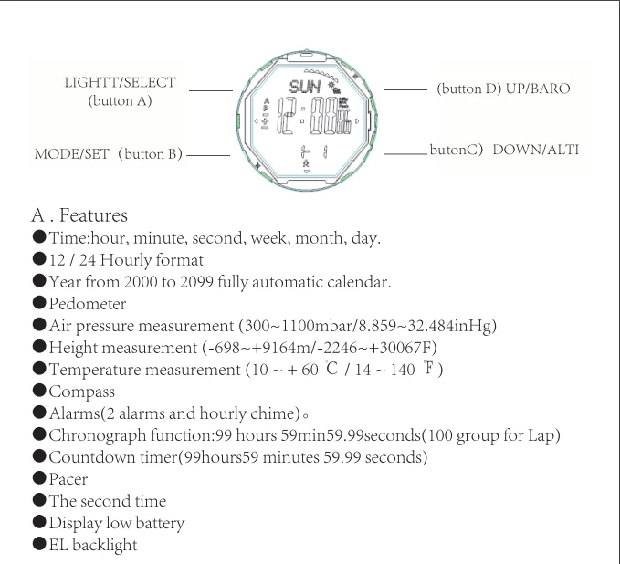 Уличные спортивные умные многофункциональные часы для альпинизма и плавания Вес единицы: 0,35 кг Объем продукта: 10,0 см * 8,0 см * 10,0 см Цвет: синий, черный, красный, оранжевый, зеленый, хаки Емкость аккумулятора: Кнопочная батарея Вес изделия; 78 (г) Материал экрана: твердое минеральное стекло Упаковочный лист: Руководство по эксплуатации, часы, ткань для очистки, гарантийный талон