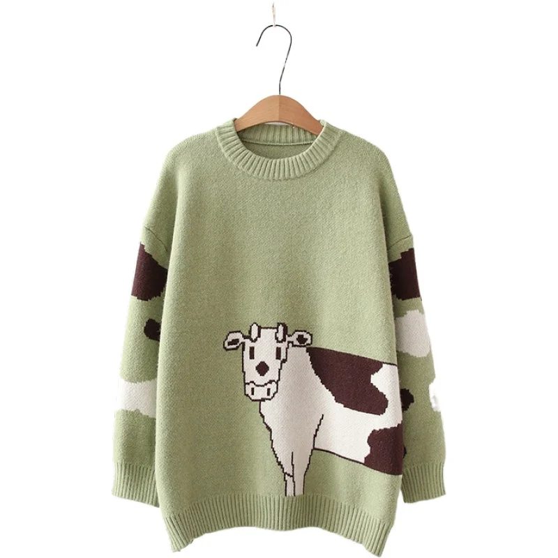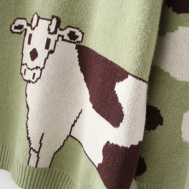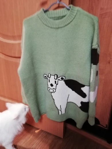 Джемпер отличный, давно на него смотрела, но боялась заказывать, потому как я не любитель огромных мешкообразных моделей, рост небольшой и я не худышка. Но уж больно хороша корова! Заказала на чёрную пятницу и не разочаровалась ни в товаре, ни в продавце. Джемпер безумно понравился, на 46-48 размер ОБ 93 см, ОТ 100 и рост 158 см сел отлично, в меру свободно, этакий лёгкий оверсайз, не такой огромный как на модели. Длина рукава мне в самый раз, на больший рост будет короче. Длина тоже норм, попу прикрывает полностью) Цвет точно как на фото продавца, спокойный оливковый. Ну а уж корова - это просто прелесть! Рисунок с полочки на спинку переходит практически стык в стык. Швы обработаны хорошо. Бирки с составом нет, но джемпер мягкий тёплый и не колючий, что немаловажно. Упакован в зип-пакет, в подарок верёвка-браслет. Доставка быстрая, меньше 3 недель. К покупке рекомендую однозначно!