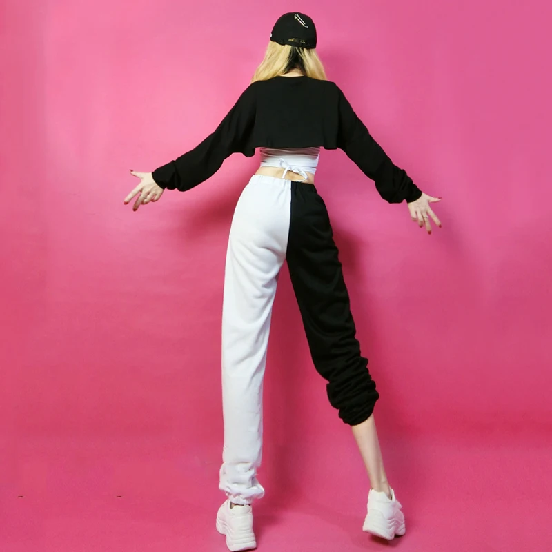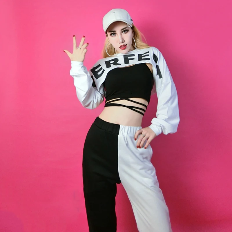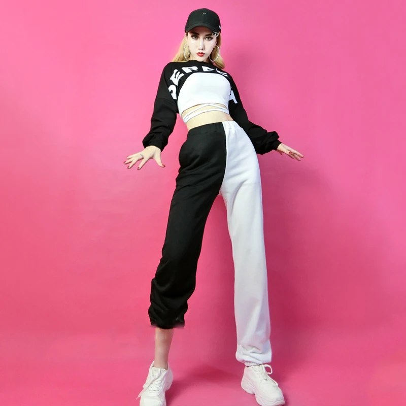 Женская Одежда для танцев на шесте, костюм для хип-хопа, черный и белый топ, комплект со штанами, одежда для джазового шоу, одежда для Dj сцены, наряд DNV13985