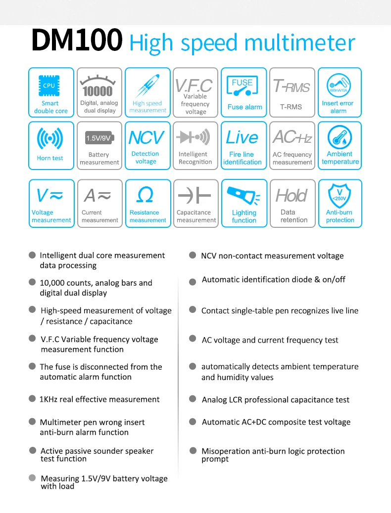 Высокоскоростное измерение напряжения переменного и постоянного тока: Файл напряжения ACV может завершить тест Напряжения переменного тока и напряжения постоянного тока, и может войти Режим VFC для измерения переменного напряжения С реальными измерениями RMS. Высокоскоростное измерение 0 ~ 100 Ом Большой диапазон: Не нужно ждать подсчета Хопа, когда Измерение сопротивления, DM100 непосредственно Из результатов измерений, можно сравнить Тестовый эффект большого сопротивления очевиден, Тест на сопротивление очень быстрый. Высокоскоростное измерение 0 ~ 10mF конденсатора: Высокоскоростное измерение емкости, Быстрая скорость, точное считывание, DM100 Высокоскоростной пробоотборник и высокоскоростной счетчик Производительность может непосредственно отображать ток Емкость за короткое время.
