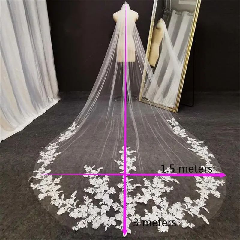 Длинная Кружевная аппликация свадебная вуаль с гребнем 3 метра Собо...