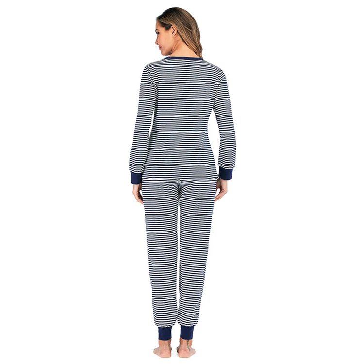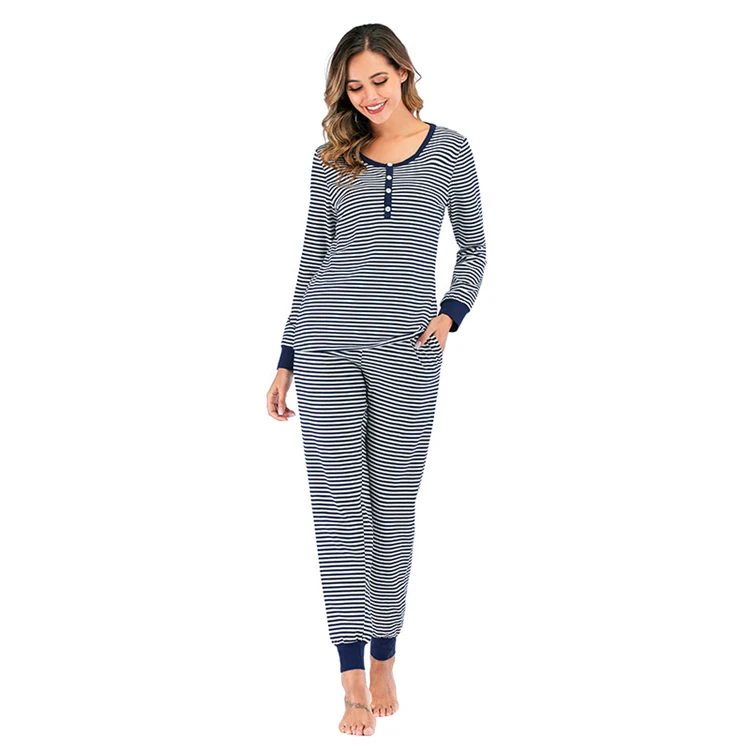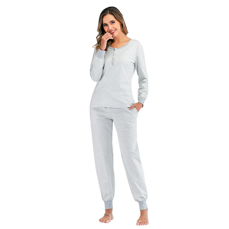 Женский пижамный комплект из 2 предметов, полосатая Хлопковая пижама с длинным рукавом и круглым вырезом, Осень-зима 2020