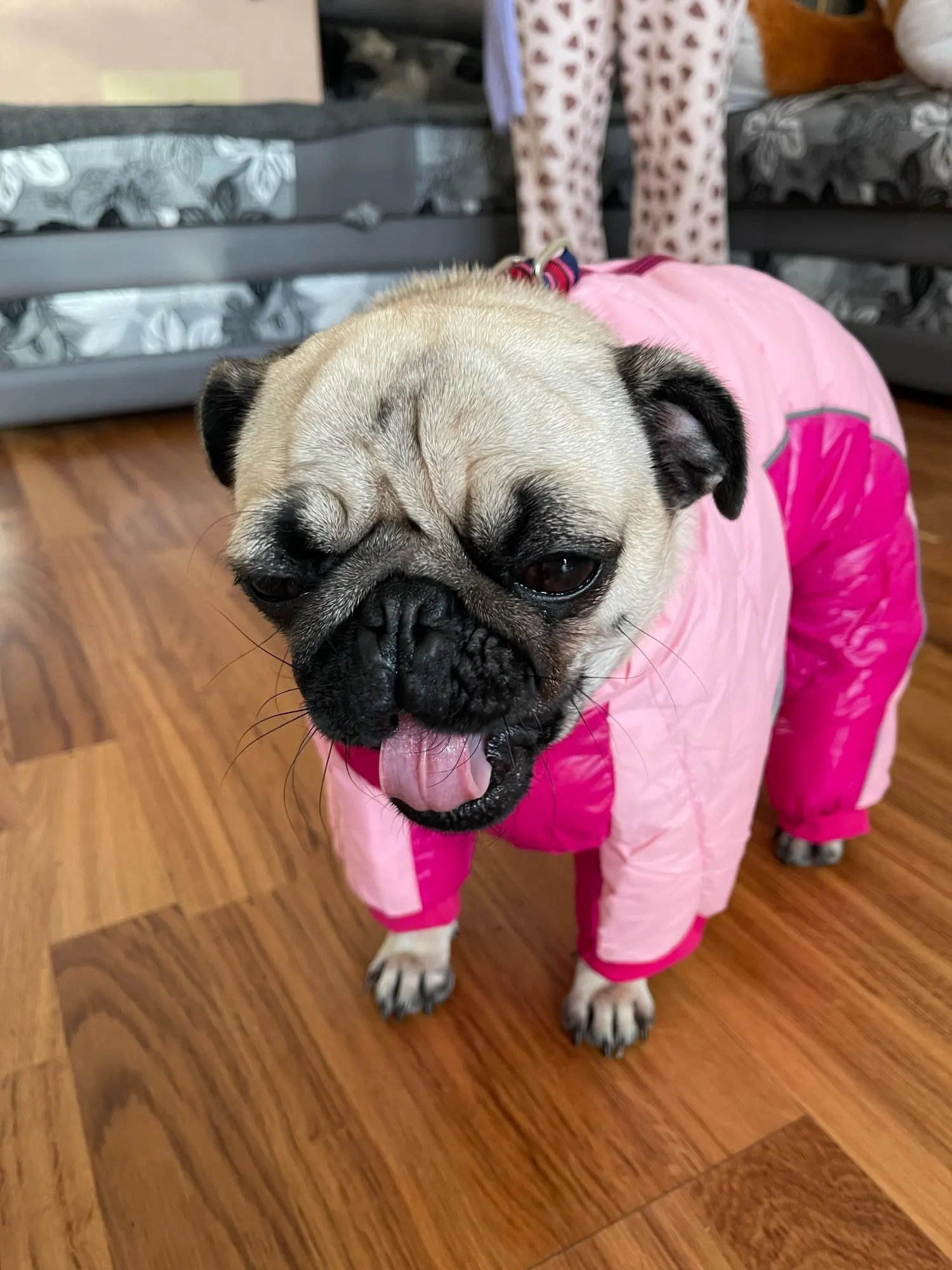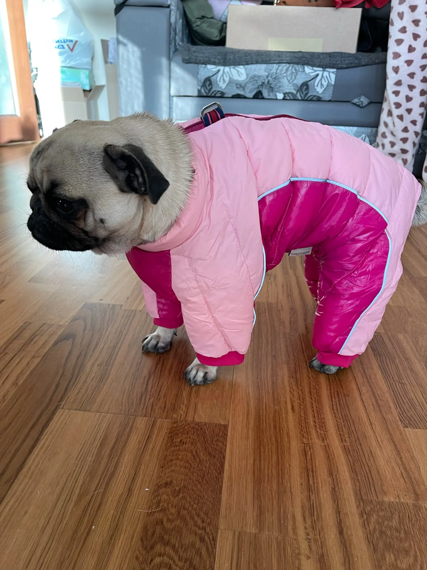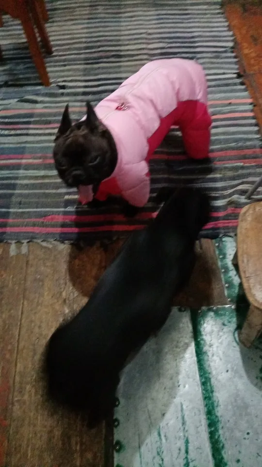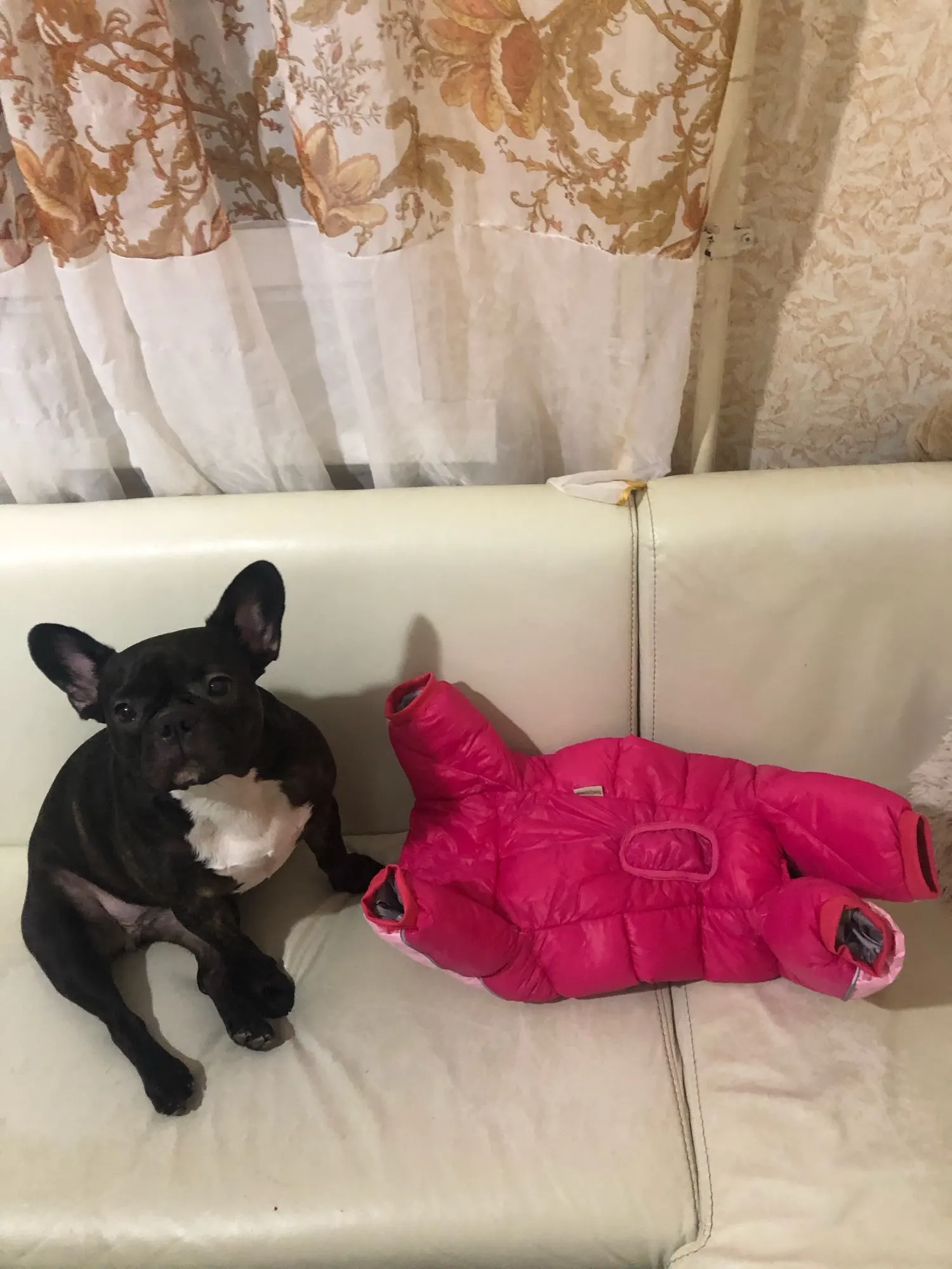Заказ получил. К сожалению он маленький оказался для мопса. Хотя выбирали строга по таблице. Если будете брать берите больше размер. Только за это три звезды. Сама куртка симпатичная и качество вроде ни чего.