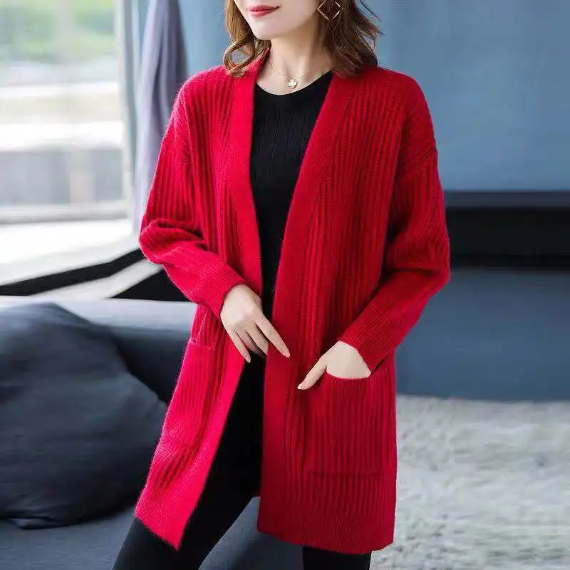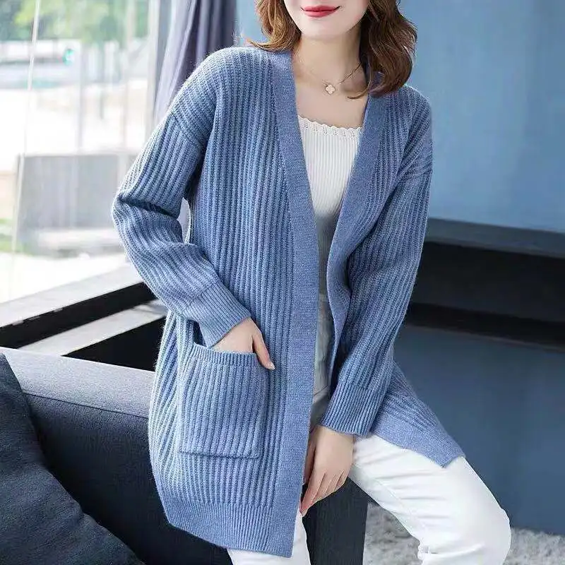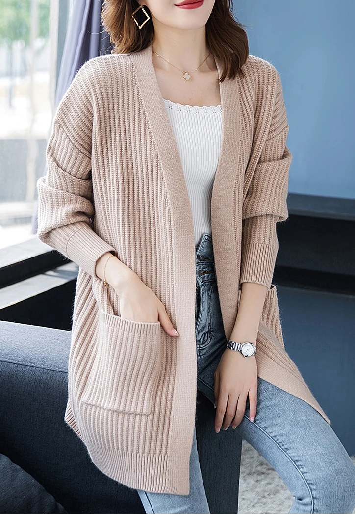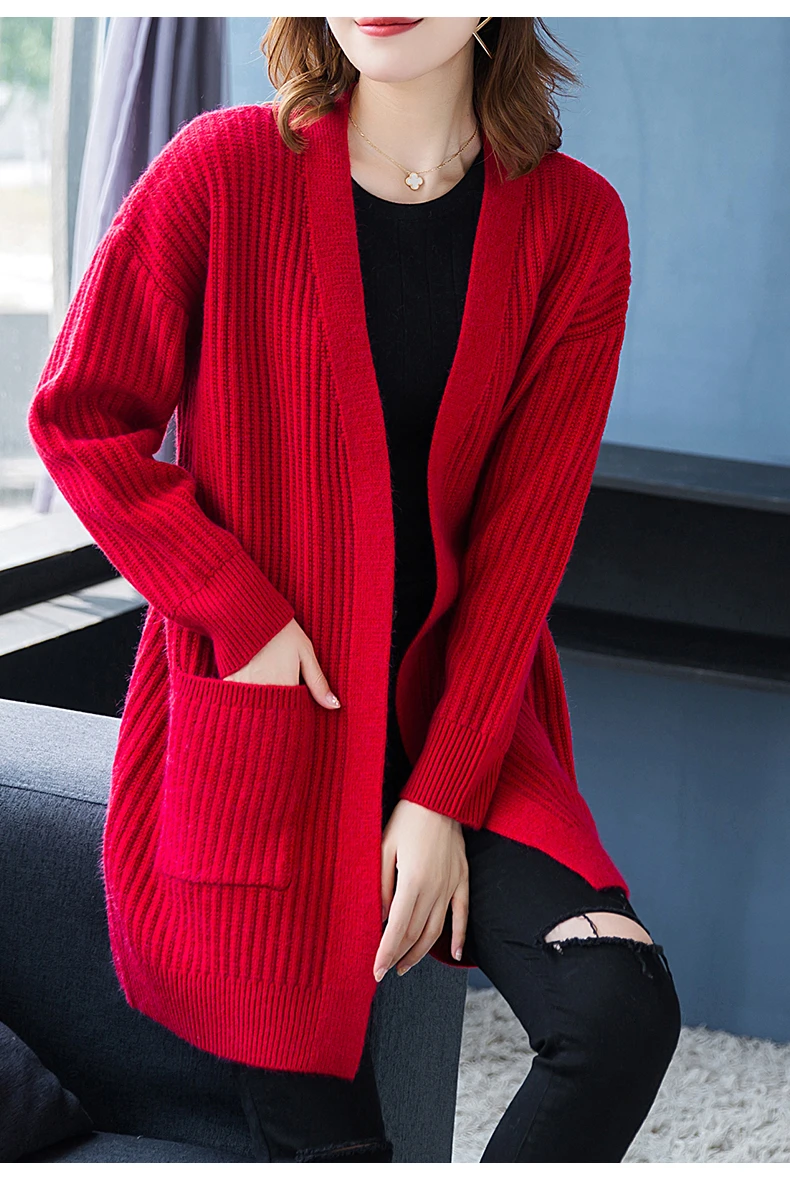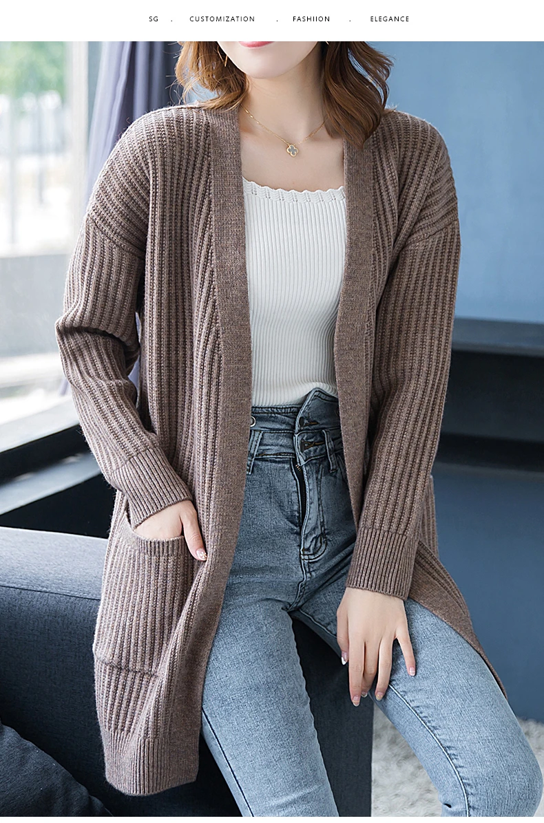 Осень 2020, новый женский кардиган, свитер, v-образный вырез, однотонный, свободный, Повседневный, длинный рукав, карман, средней длины, вязаная верхняя одежда, Ropa Mujer M261