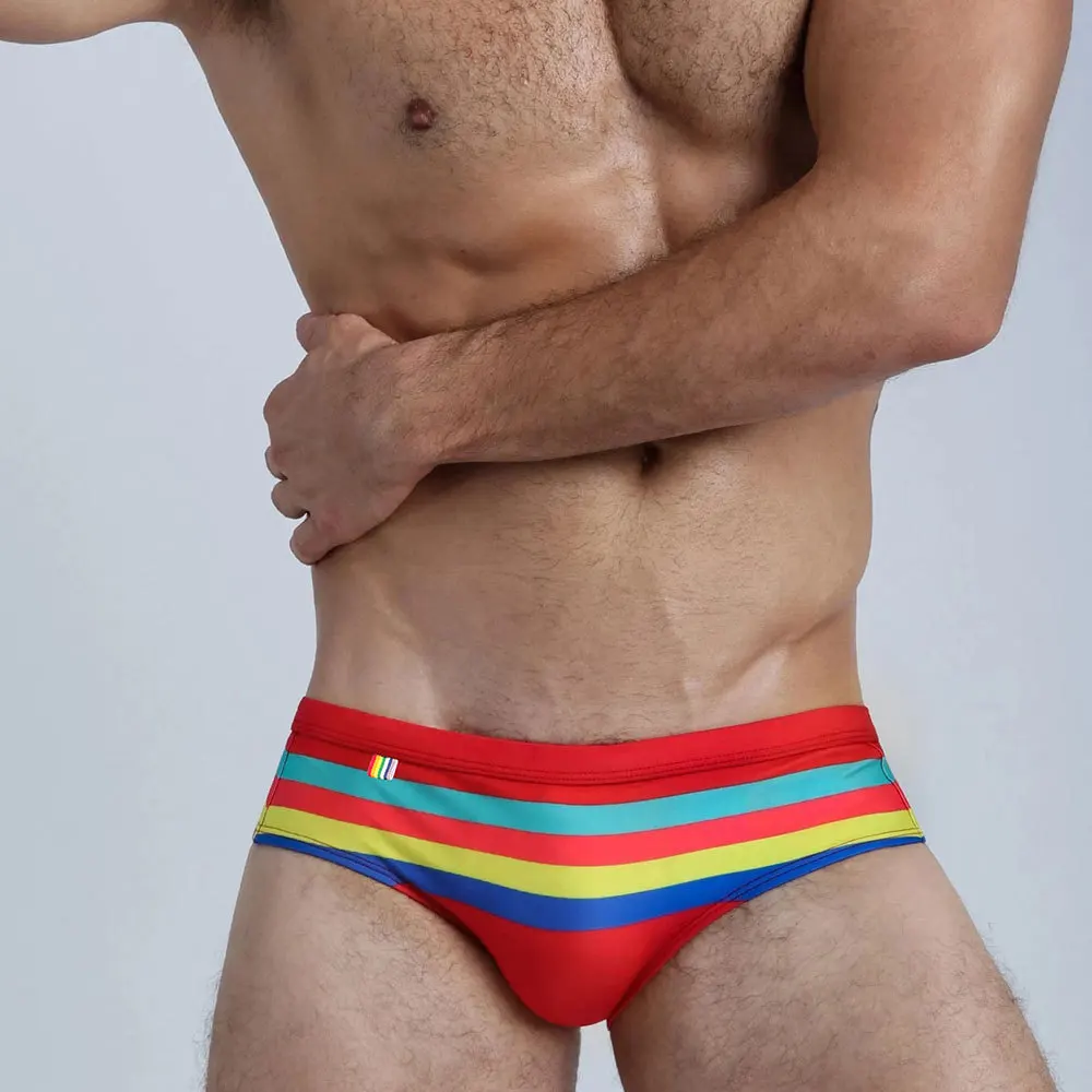 Сексуальные мужские плавательные шорты в радужную полоску, мужские трусы для плавания, Мужская одежда для плавания, Мужской купальный костюм бикини, Мужской купальный костюм с мешочком для пениса, женский купальный костюм