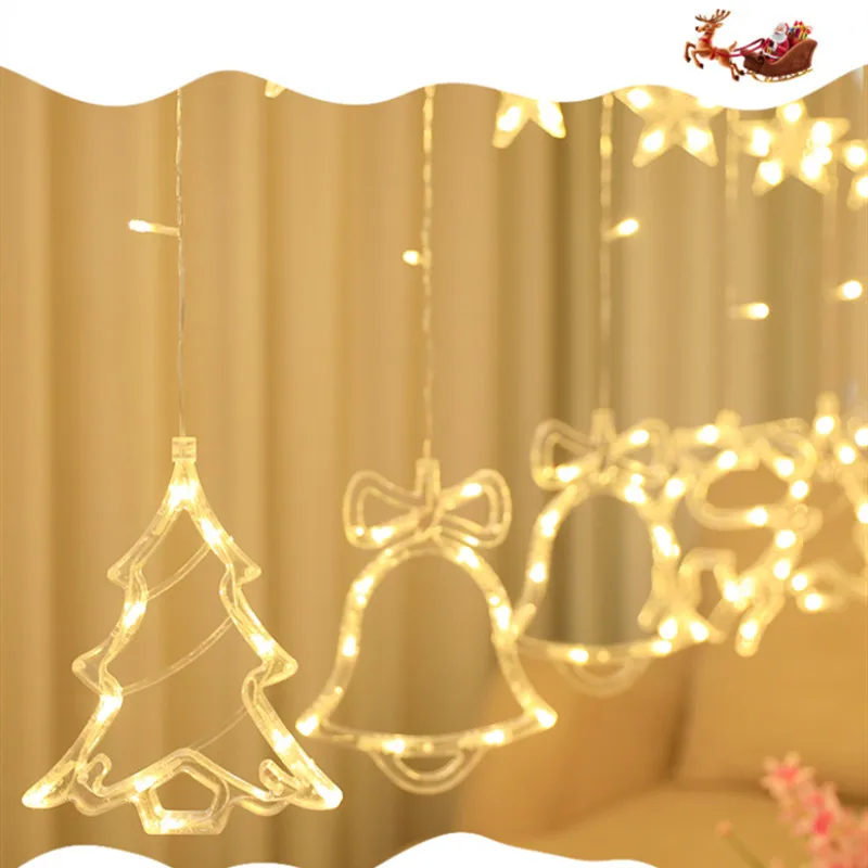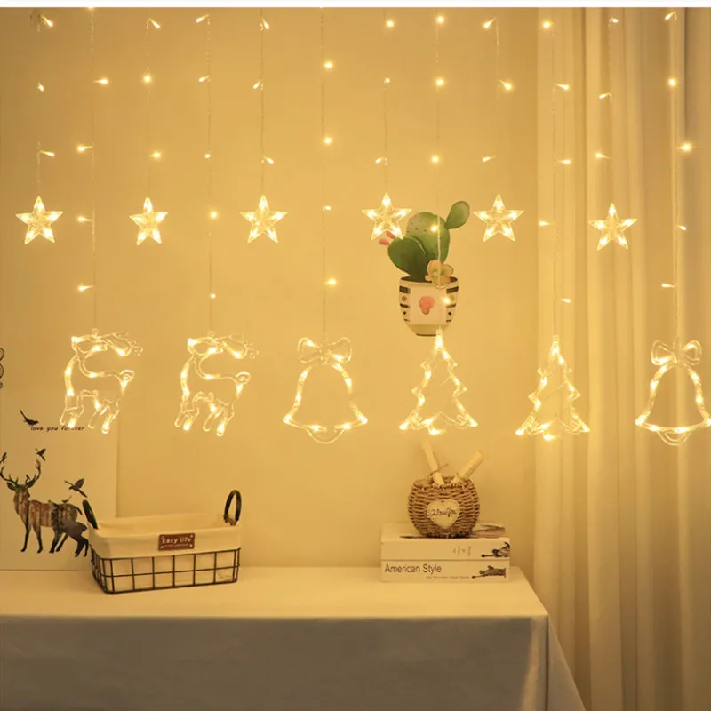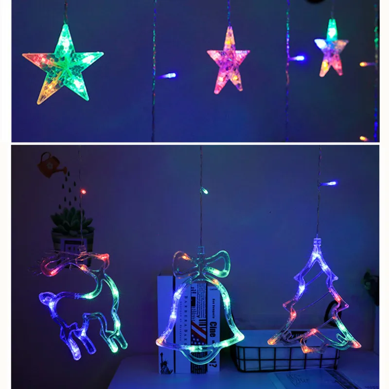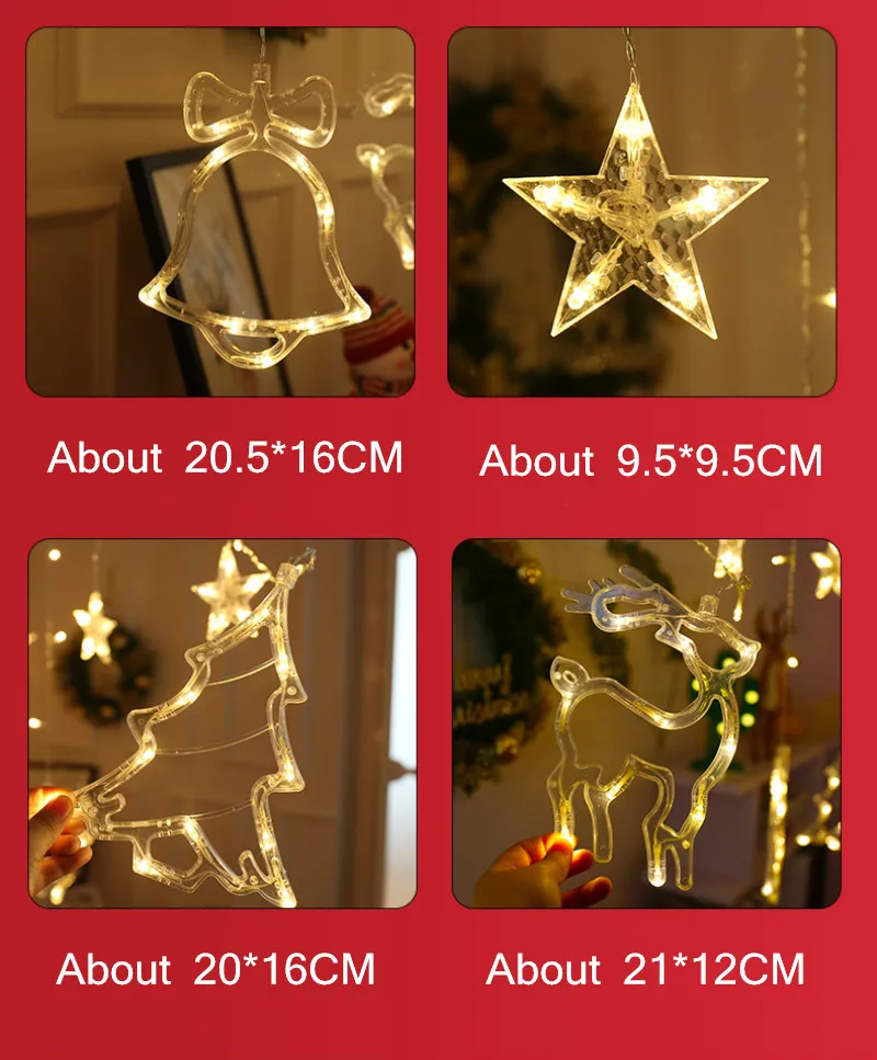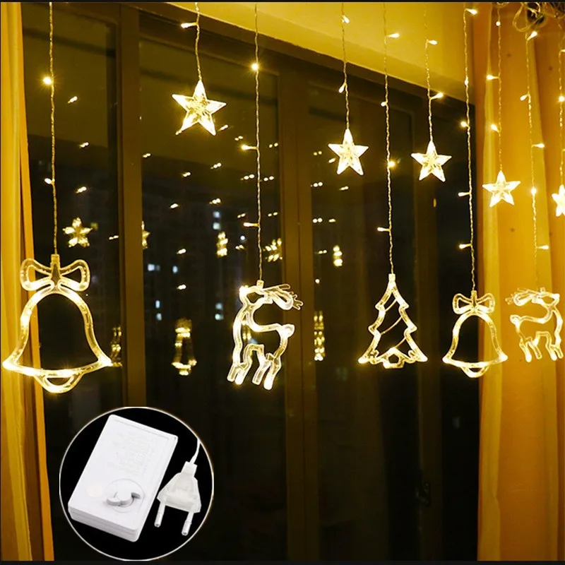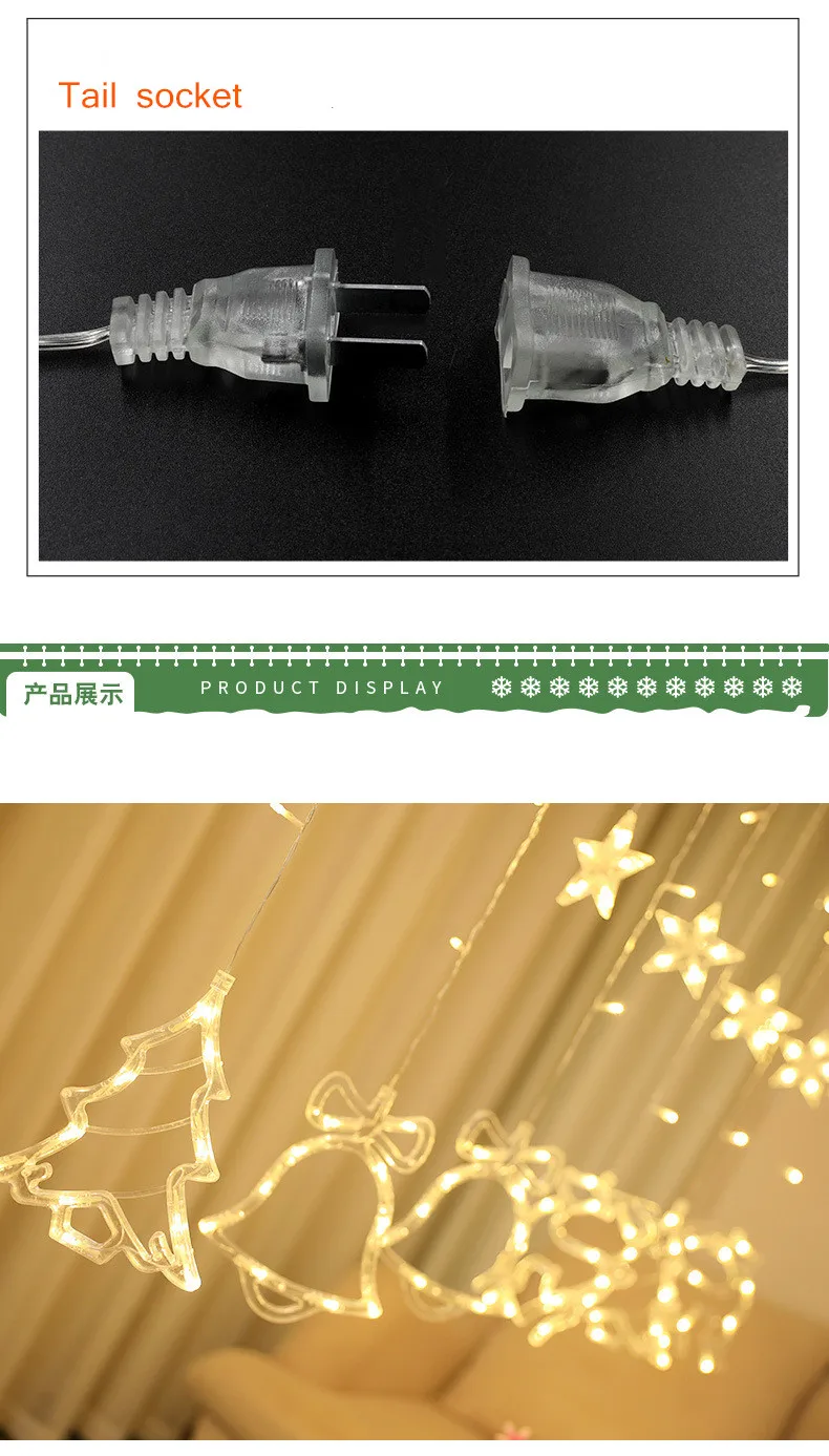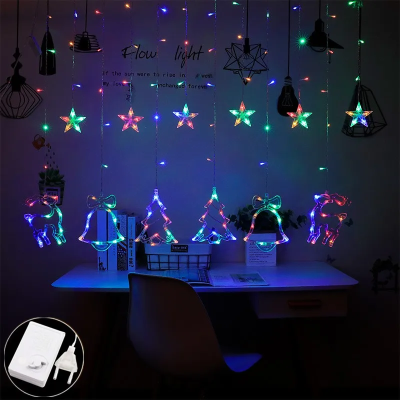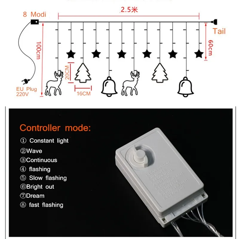 ХарактеристикиТовар светодиодный светодиодная Рождественская занавескаЦвет: теплый белый, разные цветаКласс водонепроницаемости: IP44Материал: медная проволока + пластиковая крышкаДлина: 2,5 мВысота: 0,6 м-1 мКоличество подвесок: 2 оленя, 2 Рождественские елки, 2 колокольчика, 6 маленьких звездНапряжение: 220 В переменного тока/110 В/4,5 вСтандарт Вилки: вилка ЕС/вилка СШАПодводящий провод (линия): 2 мРежим контроллера: ① постоянный светильник, ② волна, ③ непрерывный, ④ мигание⑤ Медленное мигание, ⑥ яркое излучение, ⑦мечта, ✮быстрое мигание