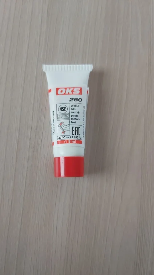 OKS 250 - это белая керамическая паста, не содержащая металлов, устойчивая к высоким температурам и одобренная NSF. Области применения: -Смазка высоконагруженных поверхностей скольжения при низких скоростях или скользящих и колебательных движениях. -Разделение поверхностей чувствительных к температуре резьбовых соединений в двигателях внутреннего сгорания и турбинах. -Защита от коррозии винтов, штифтов, болтов, фланцев, валов и переходников. -Высокоэффективная противозадирная паста, специально для использование в пищевой промышленности. -Полностью не содержит металлов для деталей тормозов в сочетании с системами ABS. Свойства: -Предотвращает истирание, горение, холодную сварку и ржавление. -По прошествии длительного времени гарантируется низкий момент ослабления резьбовых соединений. -Предотвращает выгорание нагруженных температурой винтов, болтов, фланцев, шпинделей и фитингов. -Обеспечивает хорошую защиту от коррозии. -Низкий коэффициент трения при использовании в качестве монтажной пасты. -Цвет: белый. -Основа: синтетическое масло с органическим загустителем, Mox-Active и белые твердые смазки -Плотность: 1,4 г / см³ -Диапазон температур: от -40 ° C до +1400 ° C -Пенетрация: 200-220 Допуск NSF H2 рег. 131379