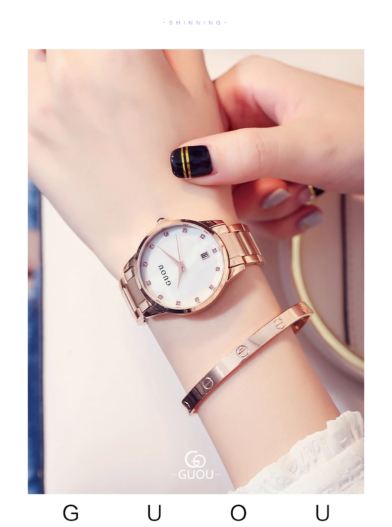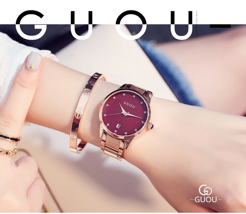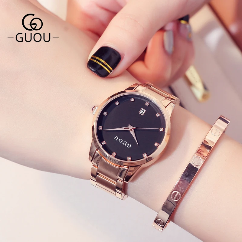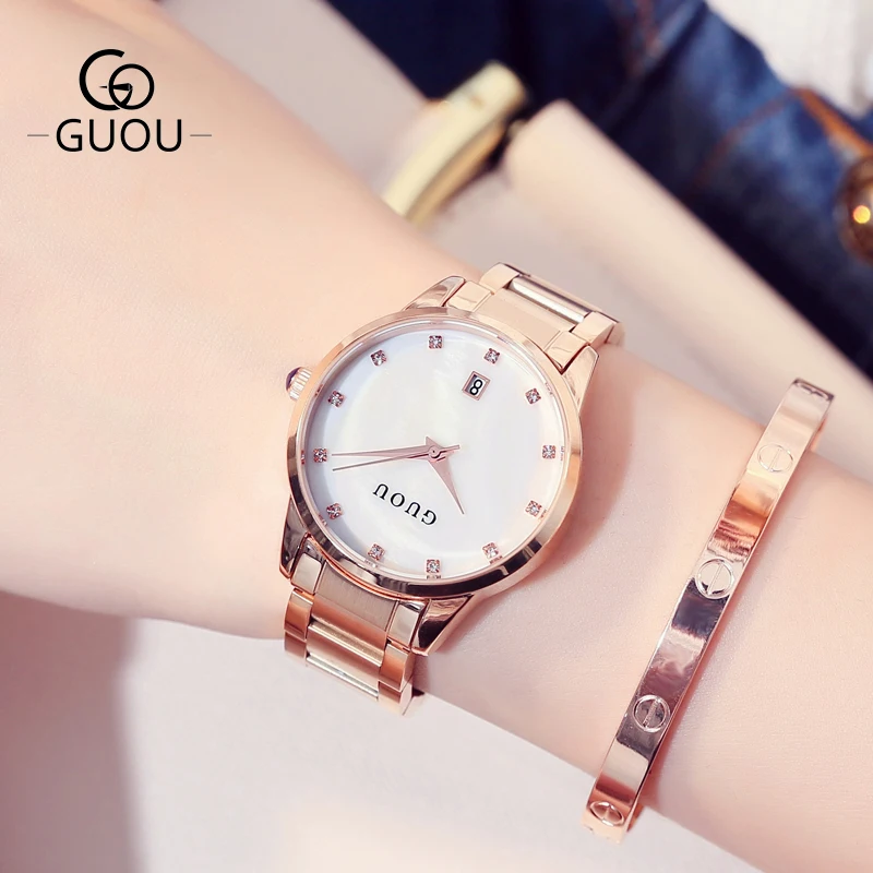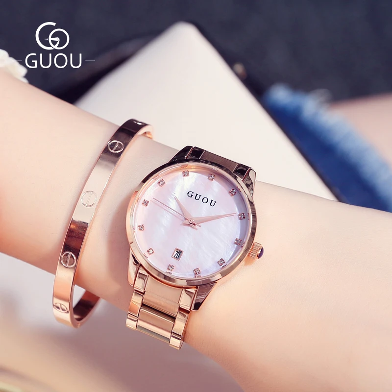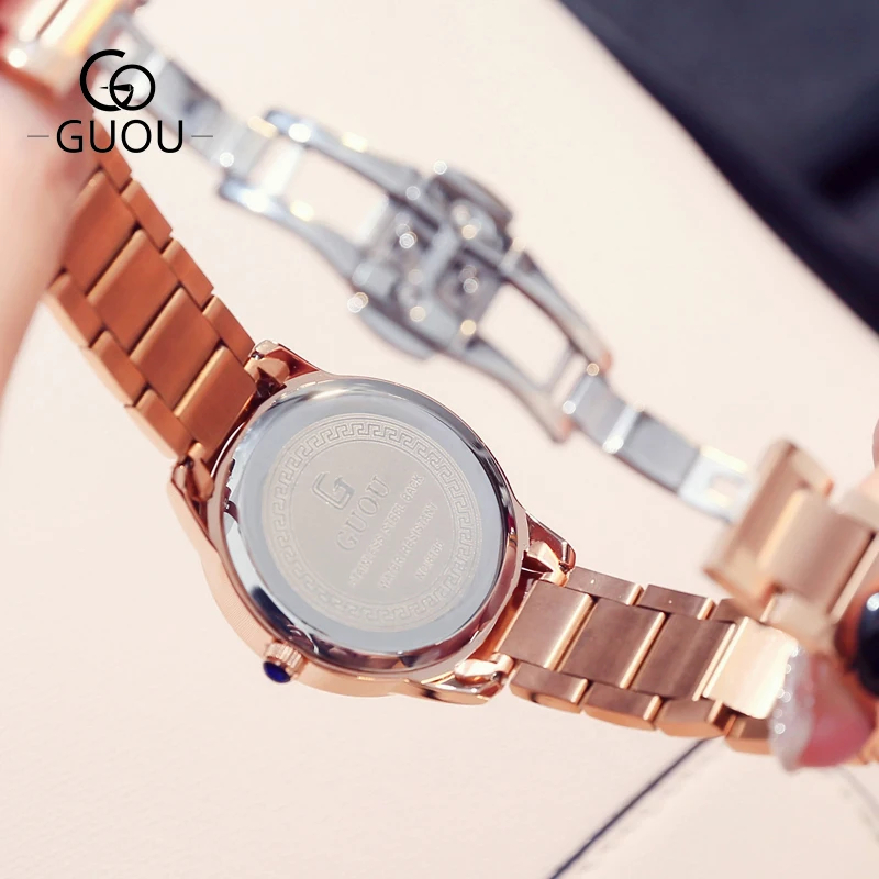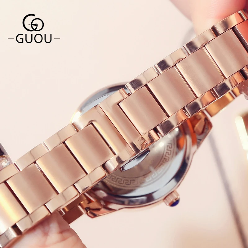 Часы наручные GUOU женские кварцевые, Роскошные позолоченные водонепроницаемые с автоматической датой, из нержавеющей стали