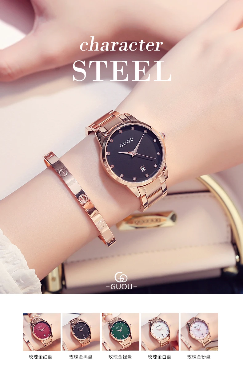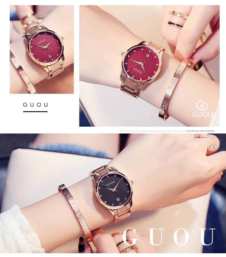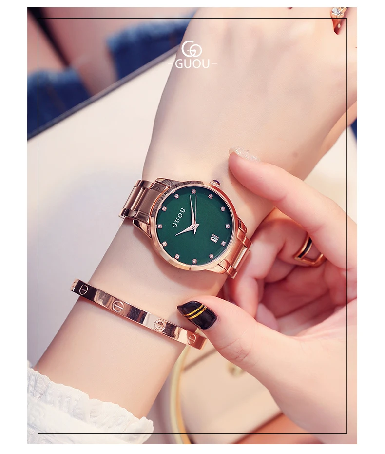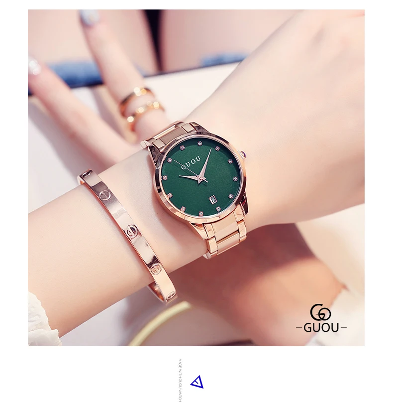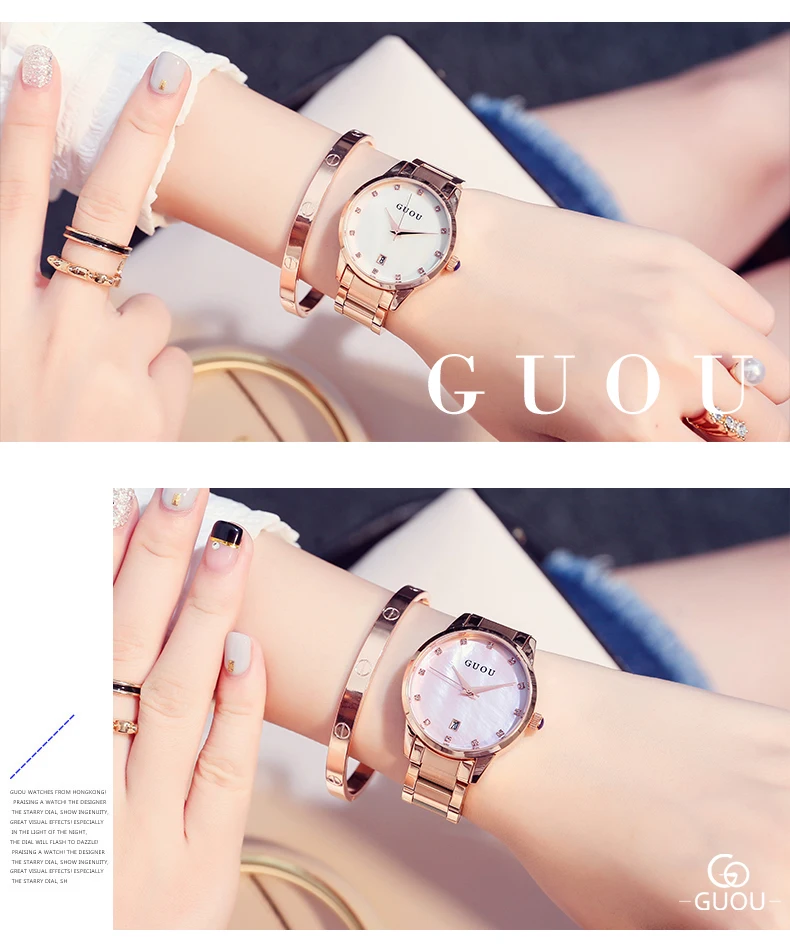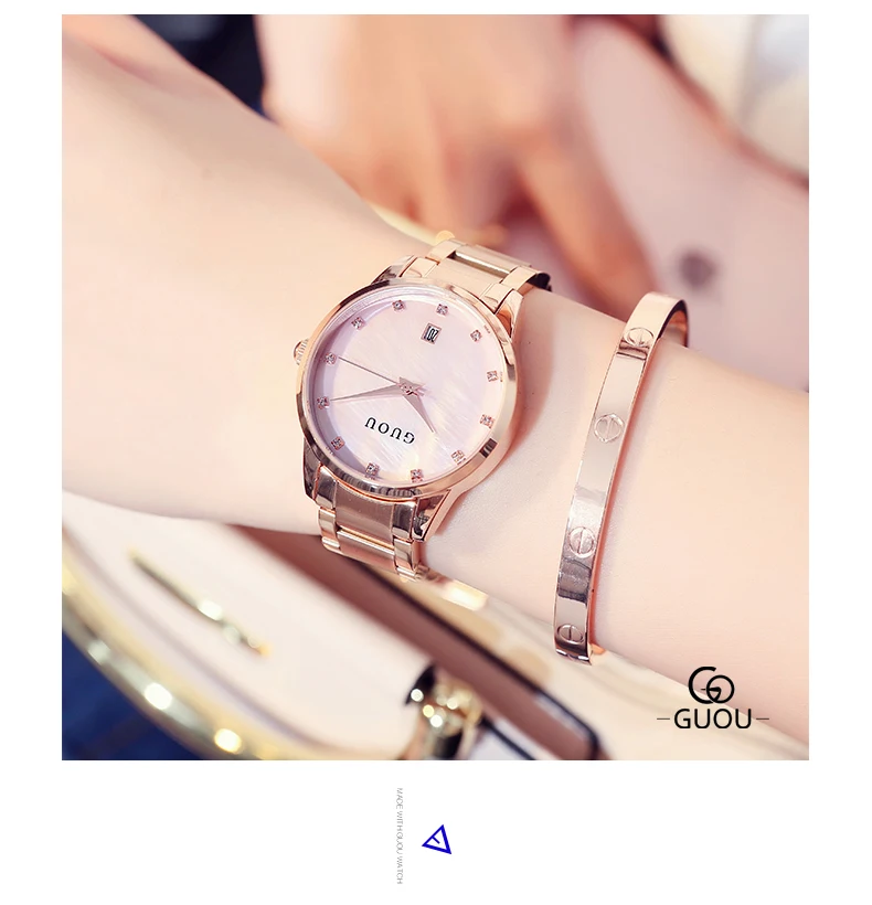 Часы наручные GUOU женские кварцевые, Роскошные позолоченные водонепроницаемые с автоматической датой, из нержавеющей стали