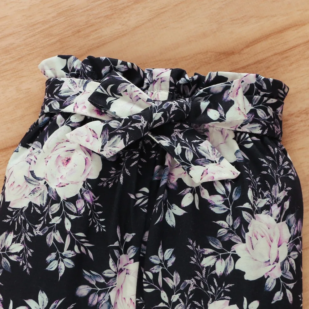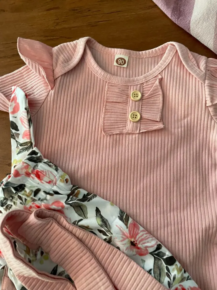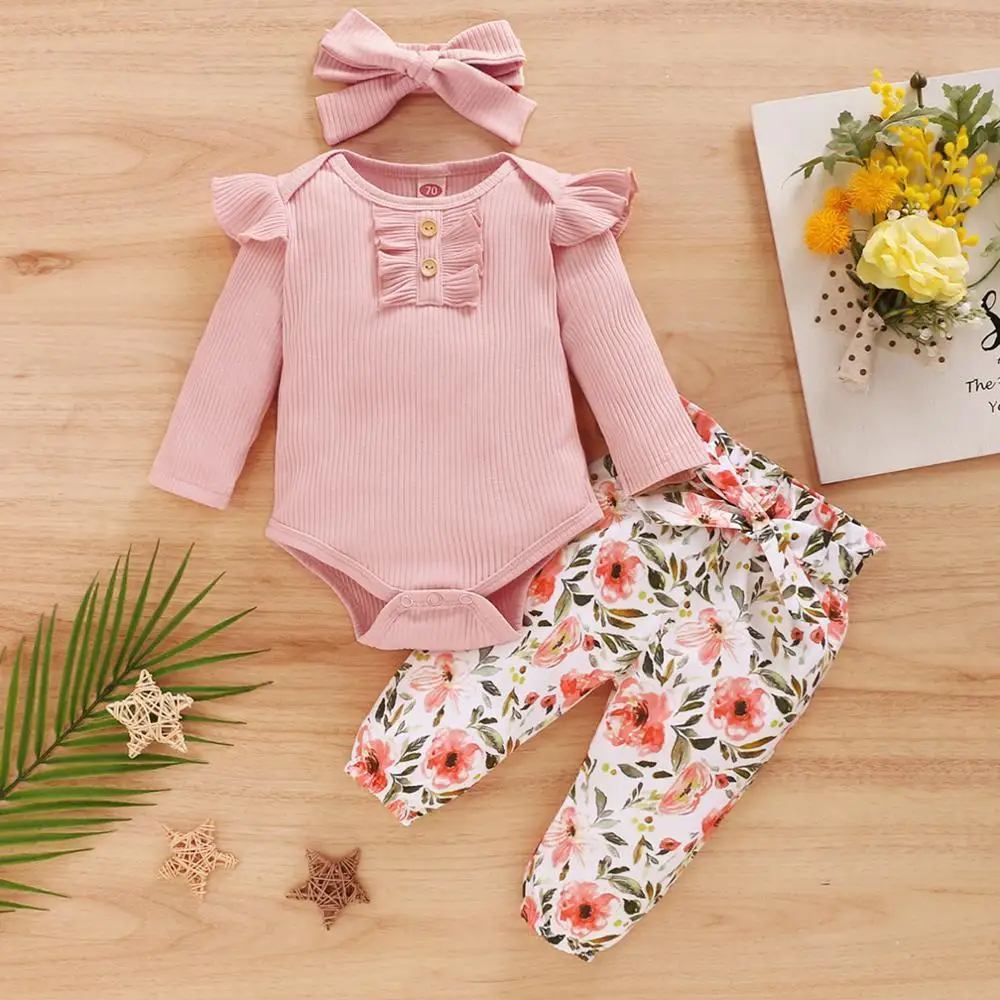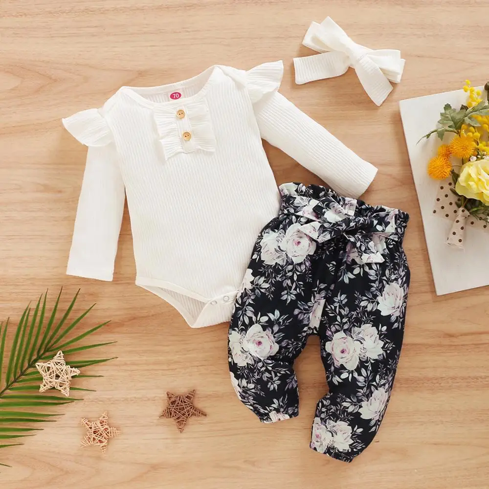 Комплект одежды для маленьких девочек, 3 шт., боди с длинным рукавом, штаны с цветочным рисунком, наряды для новорожденных, ползунки с оборками