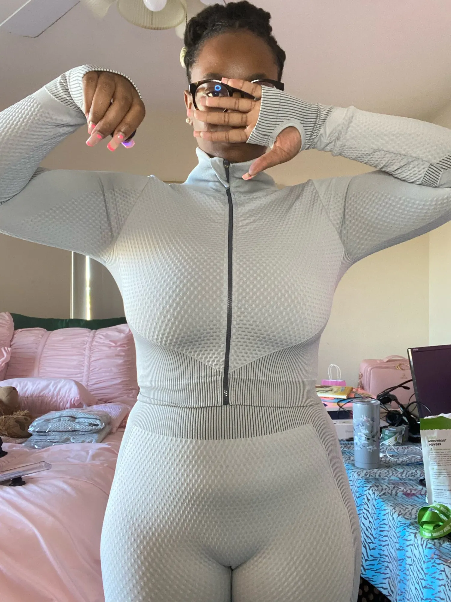 Для запуска куртки более светлый цвет, чем верх и леггинсы, более серый. Затем леггинсы, которые я получил, размер s, но я думаю, что q должен быть больше, потому что талия огромная, не подходит к телу, и ткань очень свободная, она не подходит хорошо. Топ-это единственная хорошая вещь. Доставка была быстрой в Испанию менее 10 дней. Я не рекомендую этот комплект без качества ткани.