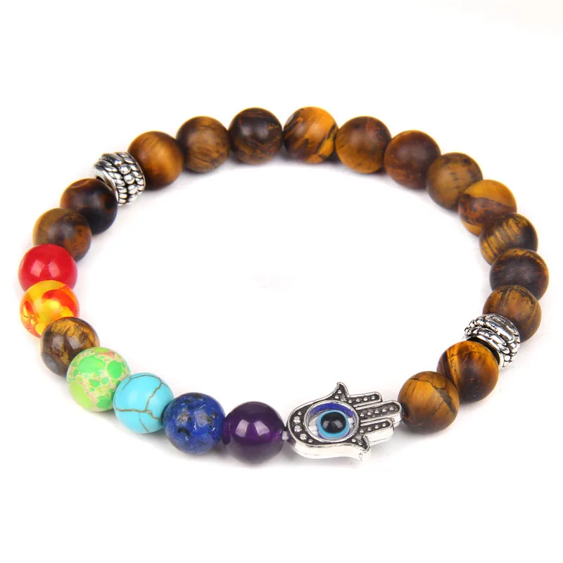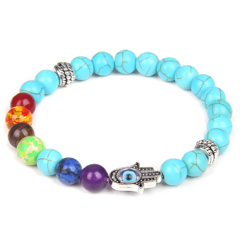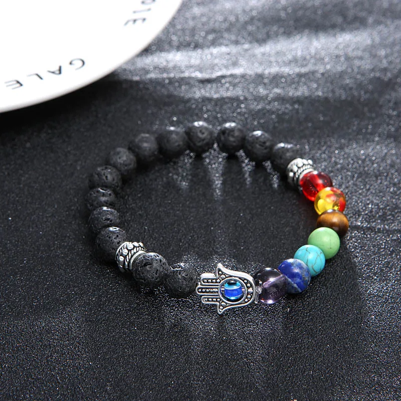 Натуральный черный лавовый камень, 7 чакр, бусины, браслет для мужчин и женщин, стрейч Фатима, Хамса, Шарм для рук, синий глаз, браслет, ювелирные изделия на удачу