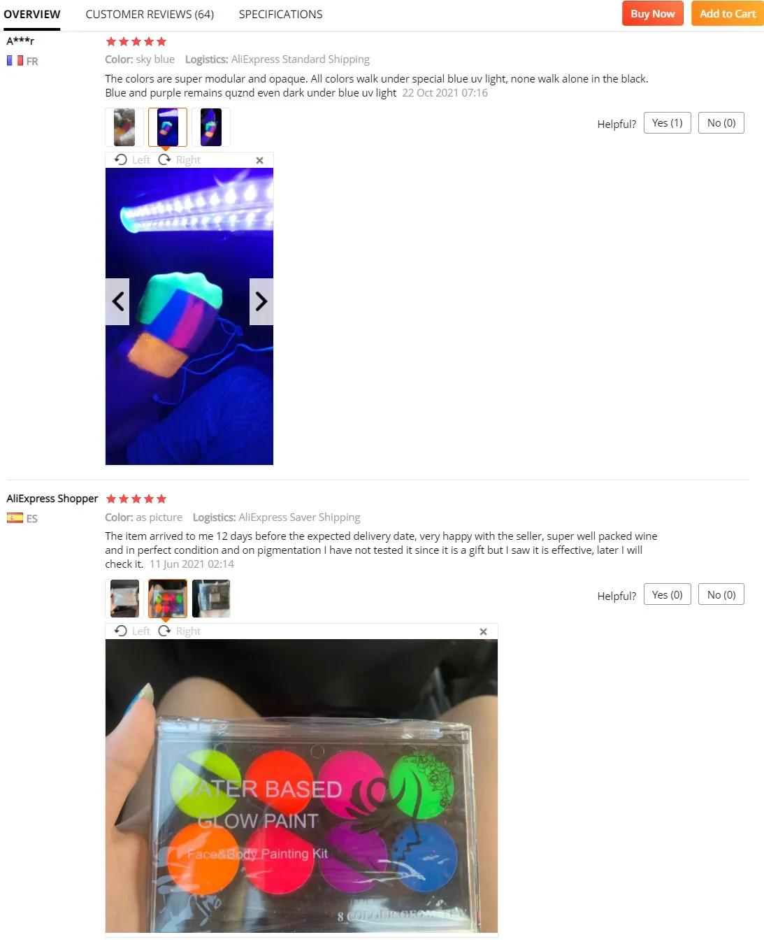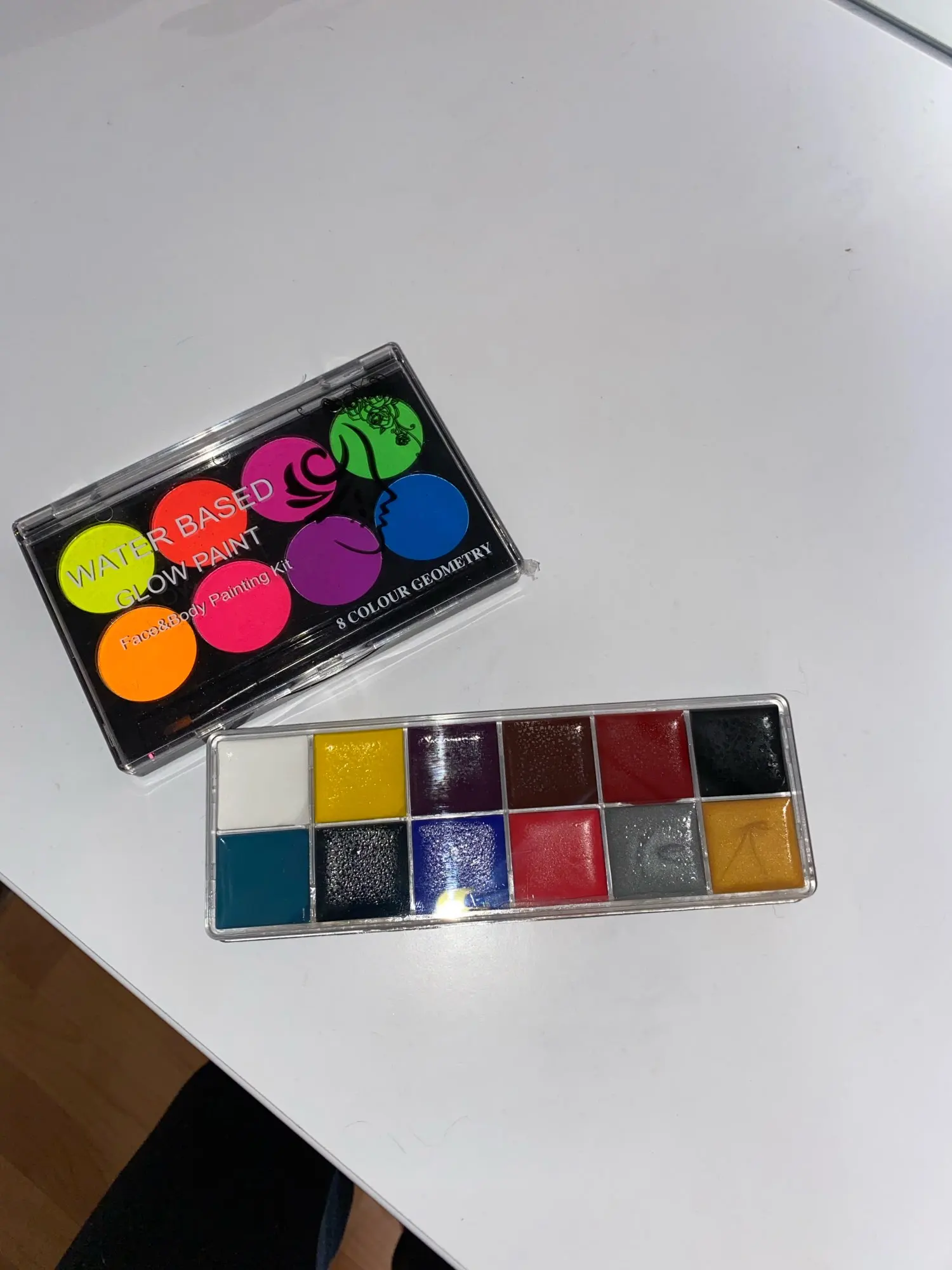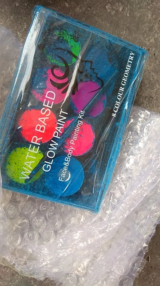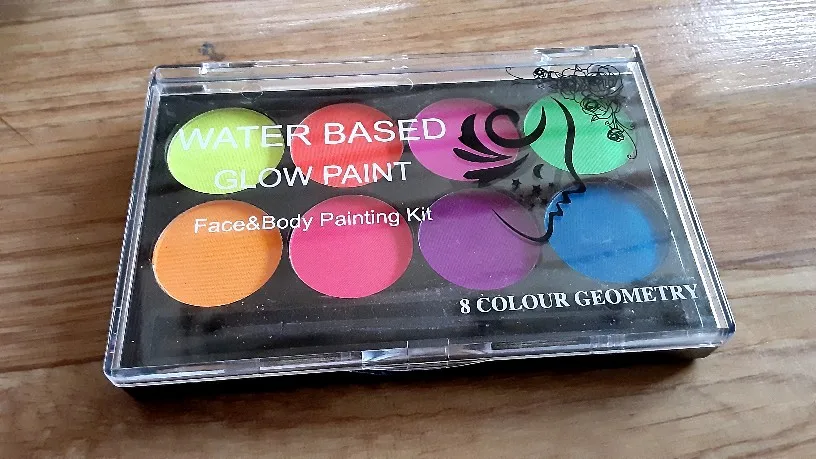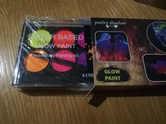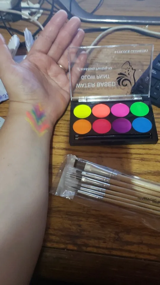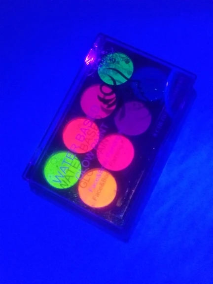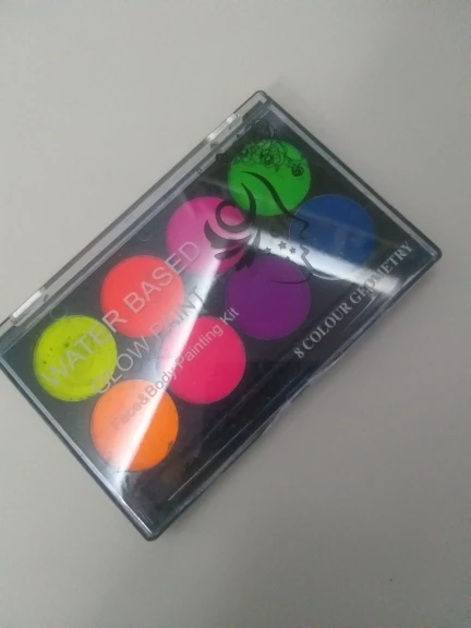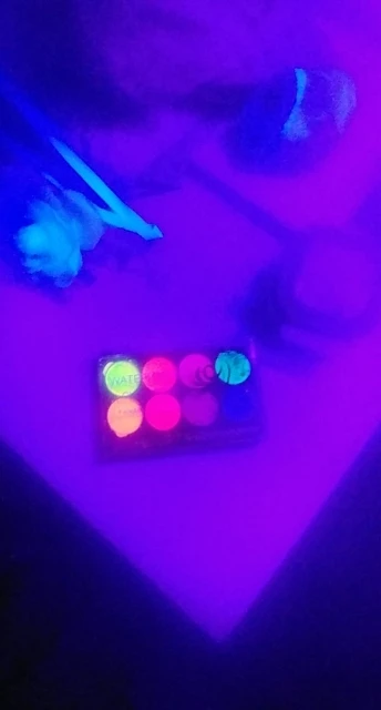 Мне очень нравится этот товар! Сначала я не понимаю, как работает палитра, но после того, как я прочитаю, я увидел, что необходимо положить воду, цвета красивые, но они не все загораются в черном цвете, только самые яркие и теплые цвета. Он не горит только в черном, но и с синим светом (у меня есть специальная Синяя лампа), я не знаю, делают ли светодиоды то же самое... Палитра довольно маленькая, но мне она подходит, достаточно цвета. Мне нужно наносить около 2 слоев, чтобы цвет был равномерным и ярким. Я бы хотел сказать все, и я рекомендую! Ps: приносим извинения за качество фотографии, цвета не только на экране, но и слишком плохие. Я также уже использовал поддон, так что он немного грязный.