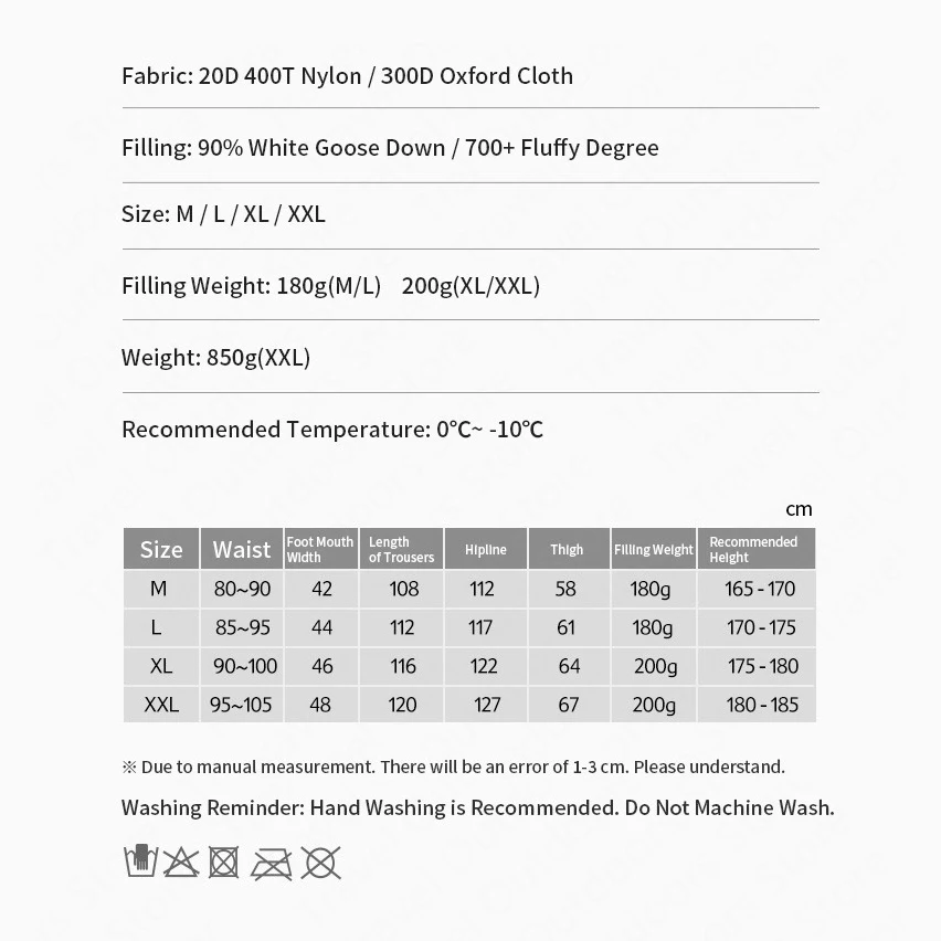 Бренд: NaturehikeНаименование товара: наружная подвеска пуховые брюкиВес: 850 г (XXL)Вес наполнителя: 180 г (M/L) / 200 г (XL/XXL)Размер: M / L / XL / XXLРекомендуемая температура: 0 ℃ ~ -10 ℃Ткань: нейлон 20D 400T/ткань Оксфорд 300DНаполнитель: 90% белый гусиный пух/700 + степень пушистости