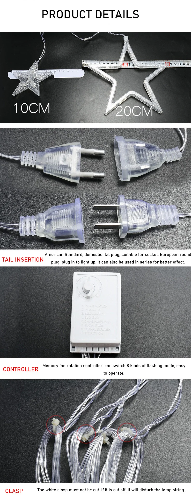 1. Вставка хвоста Американский стандарт, домашняя плоская вилка, подходит для розетки, европейская круглая вилка, подключите светильник. Он также может быть использован в серии для лучшего эффекта. 2. Контроллер Контроллер вращения вентилятора памяти, может переключать 8 видов мигающего режима, прост в эксплуатации. 3. Застежка Белая застежка не должна быть вырезана. Если он отрезан, это нарушит лампу.
