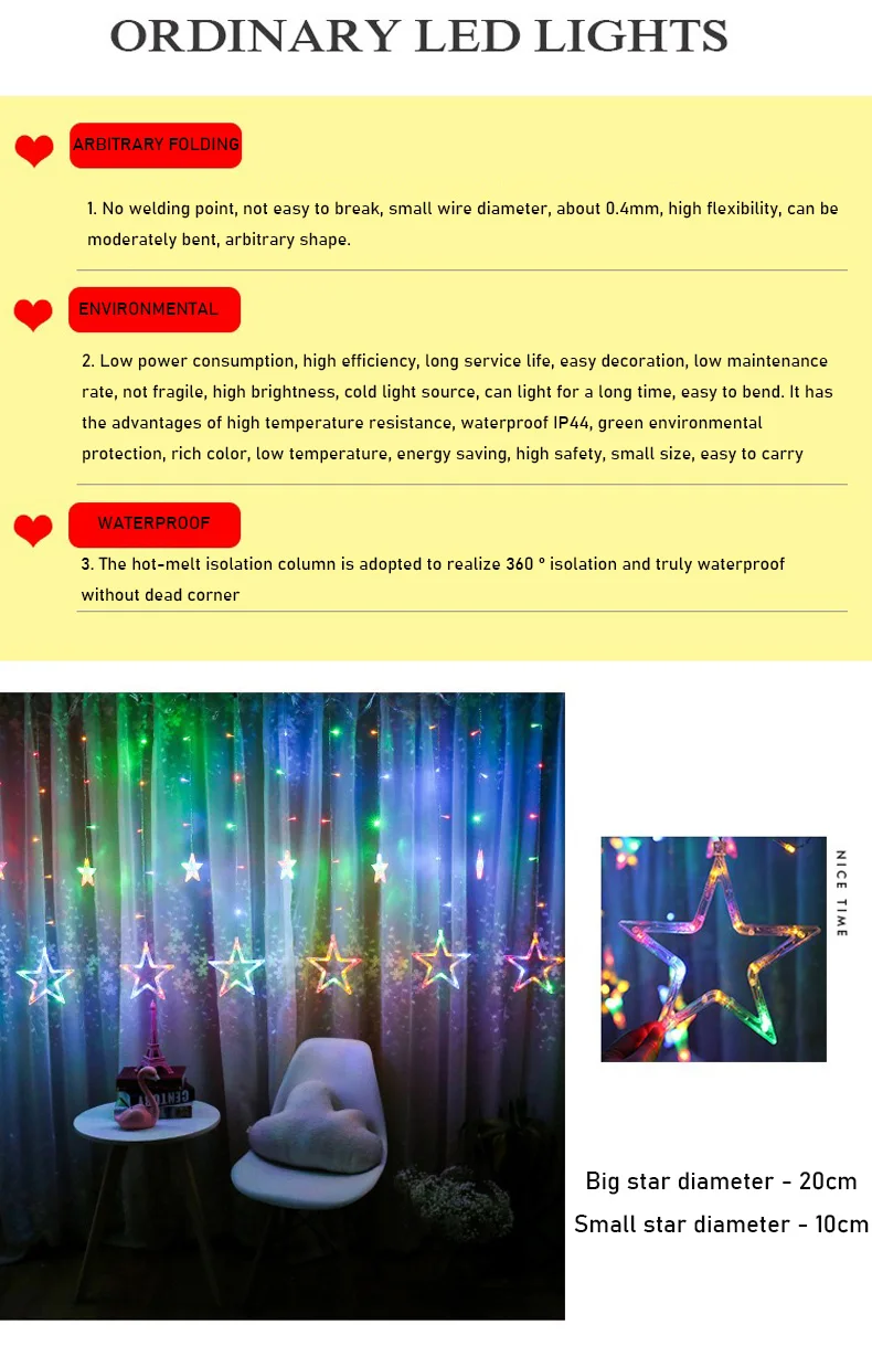 Название: светодиодный светильник для занавесок Водонепроницаемость: водонепроницаемая лампа Вилка: плоская вилка (американский стандарт), круглая вилка (европейский стандарт) Управление: Включение питания Цвет: красный, желтый, синий, зеленый, розовый, фиолетовый, теплый белый, положительный белый Функция: 8 режимов мерцания Посылка: OPP bag Напряжение: 220 В Использование: он может быть соединен в серии с серией 220 В для домашнего использования, который может реализовать общую вилку и оснащен контроллером памяти Использование: Свадебное украшение, предложение, день рождения, украшение комнаты, фотосъемка, демонстрация магазина