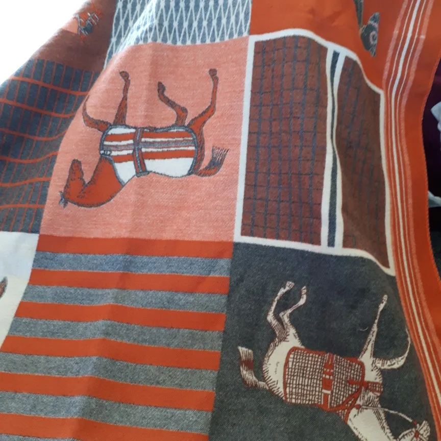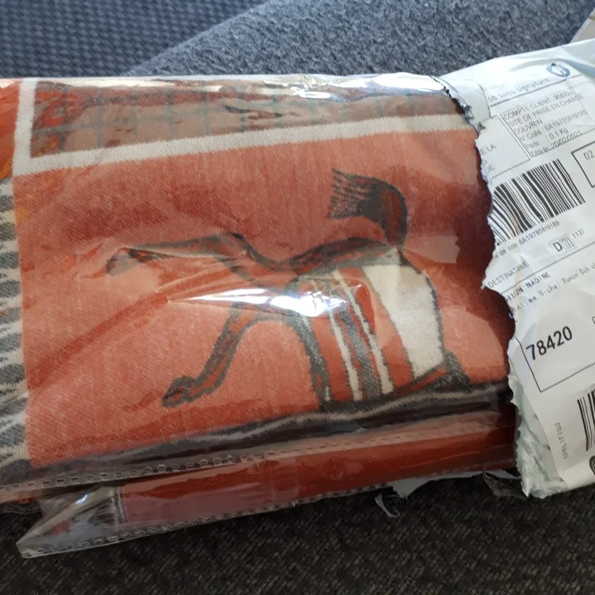 Очень мягкий, имеет правильный размер и тепло. Красивый принт, только свободная нить на одном из концов немного раздражает.