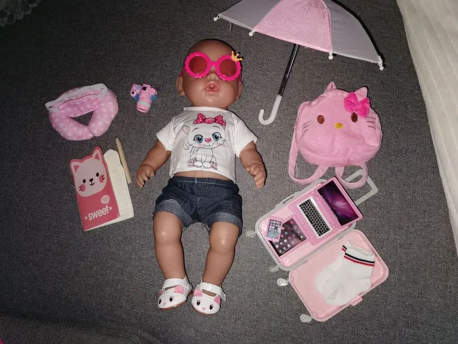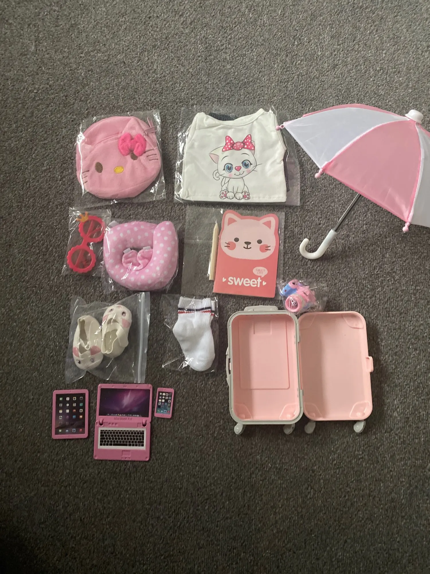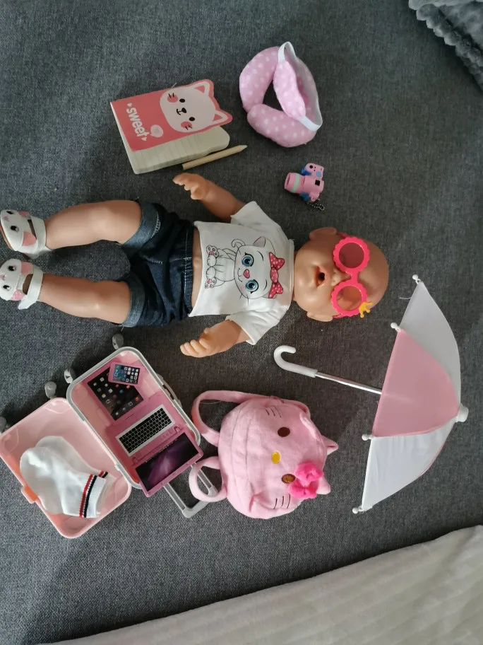 Во-первых, планшет, ноутбук, телефон металлические (довольно тяжелые, когда они вместе), но ноутбук не остается открытым, к сожалению. Настоящий блокнот и карандаш (довольно большой для куклы, но это нормально). Зонт отлично работает. Багаж имеет 4 рабочих колеса, но ручка немного жесткая. Обувь хорошо сидит, ремешок свободный, но они остаются на месте. Не примерял одежду, так как предназначено быть одаренным другу