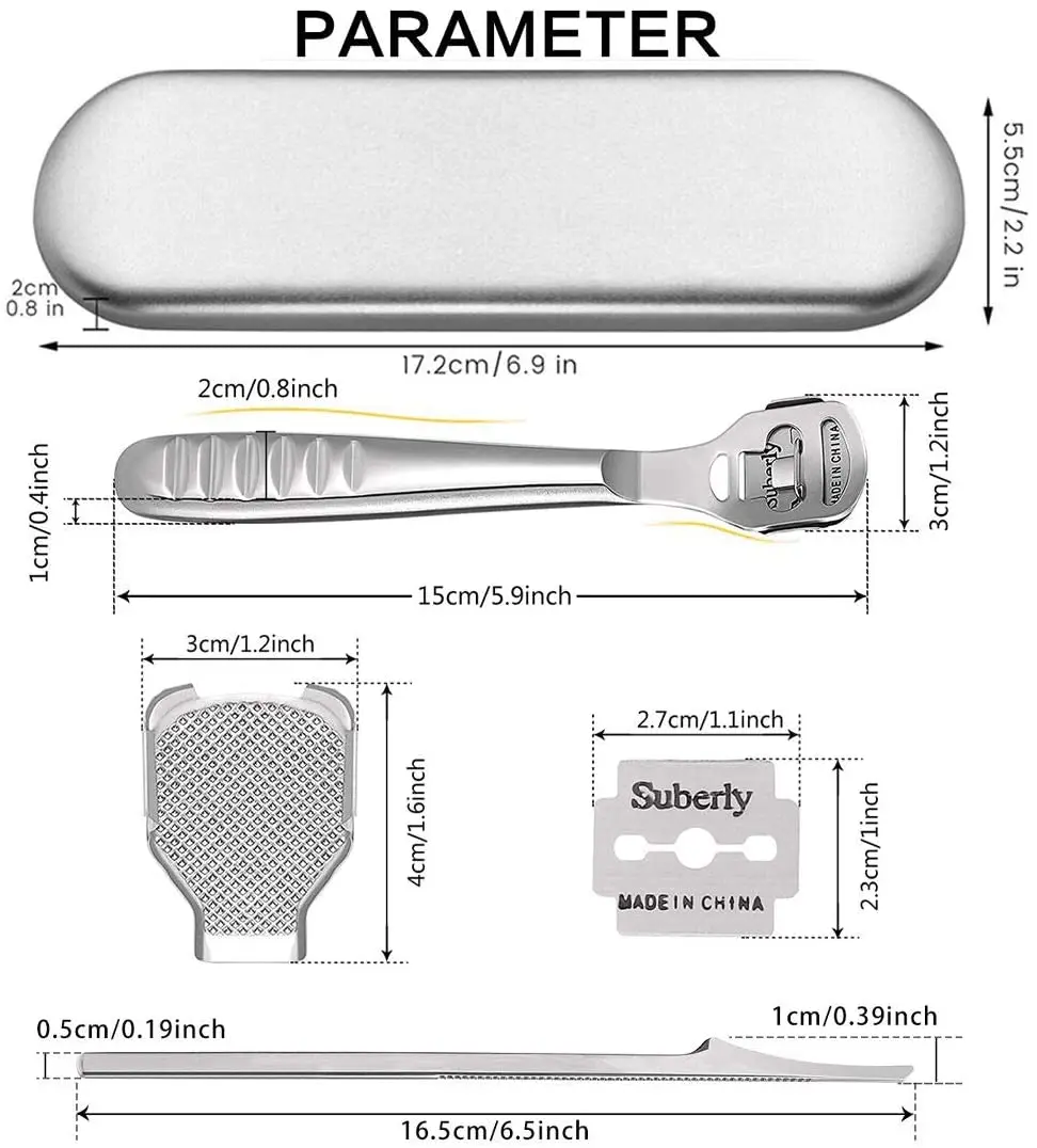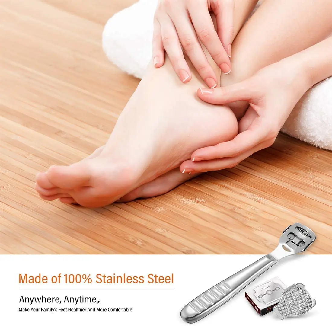 1. Набор бритвы для мозолей позволяет быстрее удалять мозоли, твердую кожу, Потрескавшиеся пятки, омертвевшую кожу и т. д., делая ступни мягче. 2. Средство для удаления мозолей на ногах изготовлено из качественной полированной нержавеющей стали, не ржавеет, не деформируется. 3. Бритва для мозолей имеет съемную головку, удобно менять, идеально подходит для кормления вросших ногтей, паронихии, сбора мозолей, удаления мозолей и кутикулы. Используйте скребок, чтобы соскребить зазоры в стопах и пятках, а боковая часть зубов потереть палец стопы, чтобы уменьшить зуд и улучшить здоровье стоп. 4. Два вида инструментов для педикюра оснащены уникальной нескользящей ручкой, обеспечивают удобный захват и плавный контроль при использовании, быстро и эффективно удаляют сухую кожу.