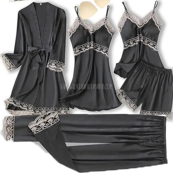 Кружевной комплект для сна Pj из 5 предметов, Женская атласная пижама, летний Пижамный костюм, сексуальная одежда для сна с V-образным вырезом, женская одежда для сна, тонкое нижнее белье