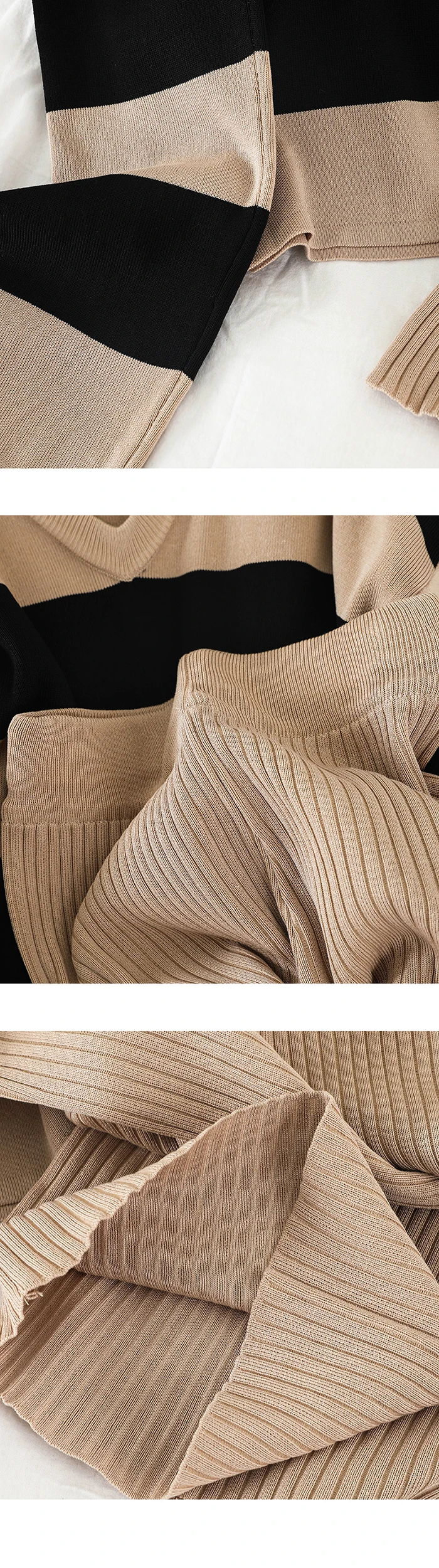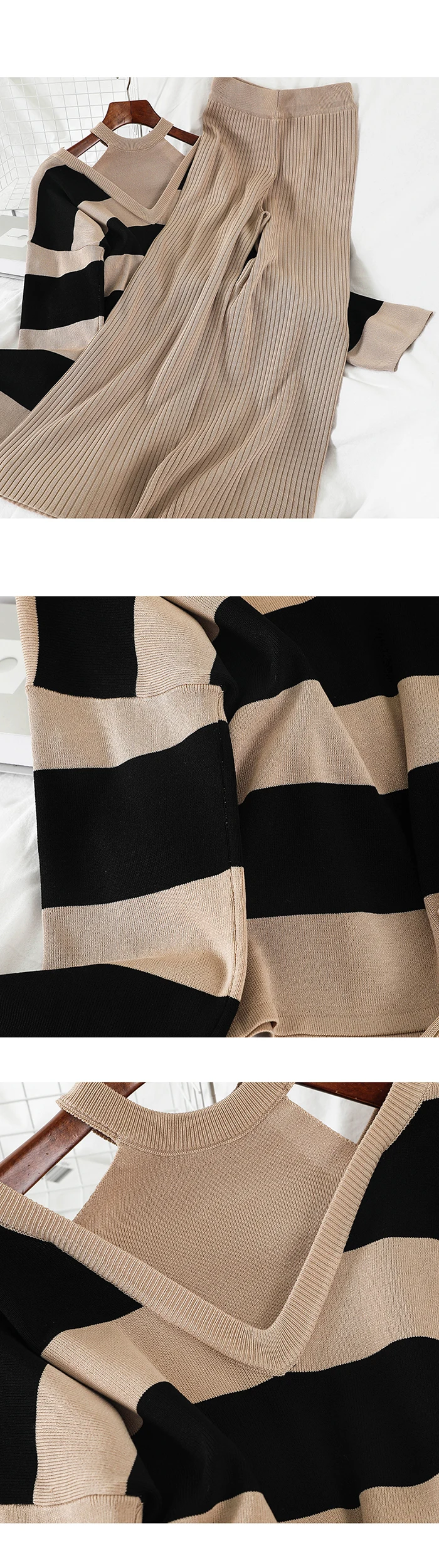 Комплект из 2 предметов, Женский трикотажный пуловер, свитер с лямкой через шею и полосатый джемпер + длинные брюки с широкими штанинами, спортивный костюм, 2020