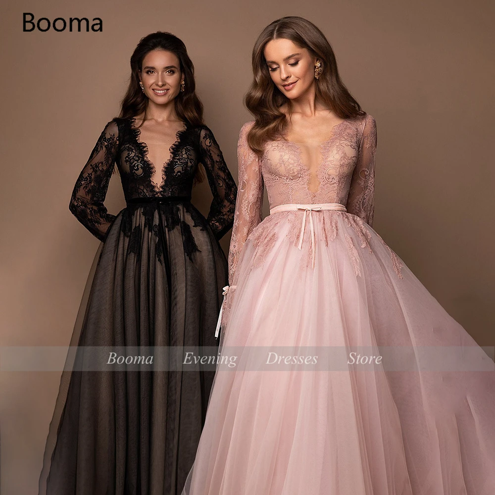 Элегантные черные платья для выпускного вечера с глубоким V-образным вырезом и длинным рукавом, кружевной лиф, вечерние платья трапециевидной формы, бархатный пояс