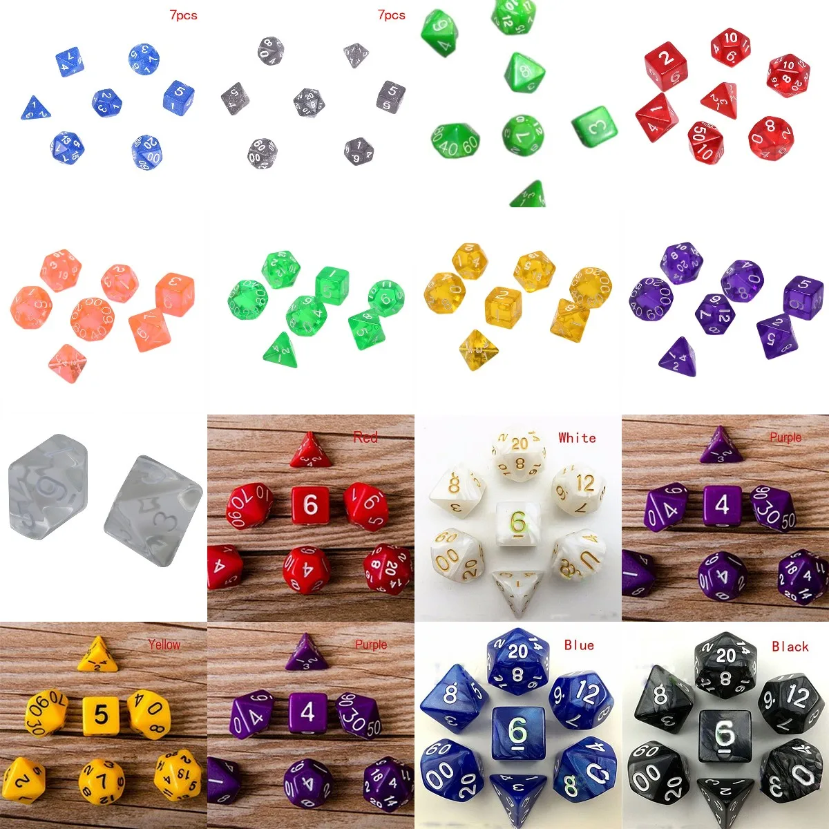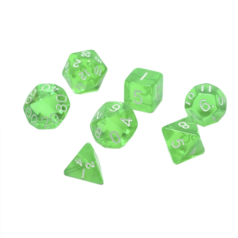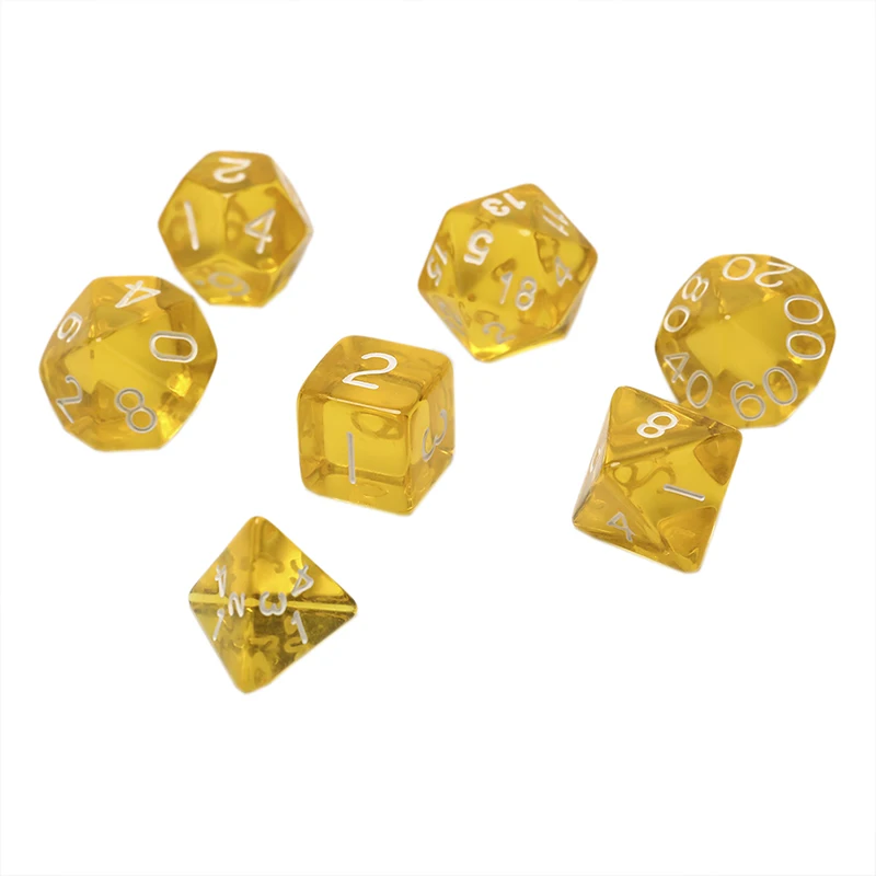 Цвет: прозрачный: красный/желтый/синий/зеленый/оранжевый/фиолетовыйМатериал: акрилКол-во: 7 шт./лотКомплектация: игральные кости 7 шт./лот