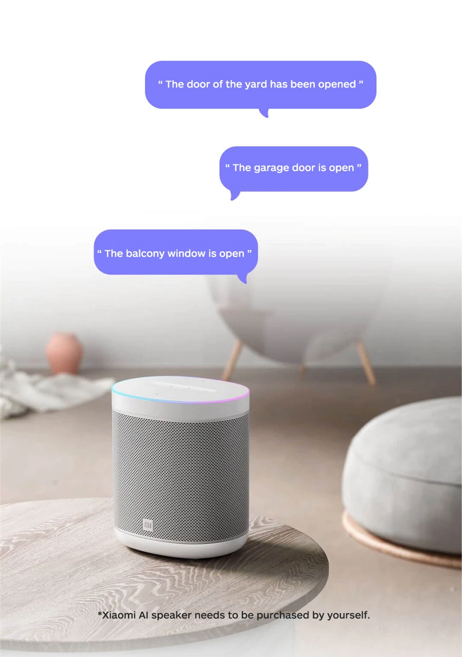 • Статус можно передавать по голосу. Вы можете взаимодействовать с динамиком Xiaomi AI дома для трансляции голоса, и вы узнаете, когда двери и окна будут открыты и закрыты. Динамик Xiaomi AI необходимо приобрести самостоятельно.