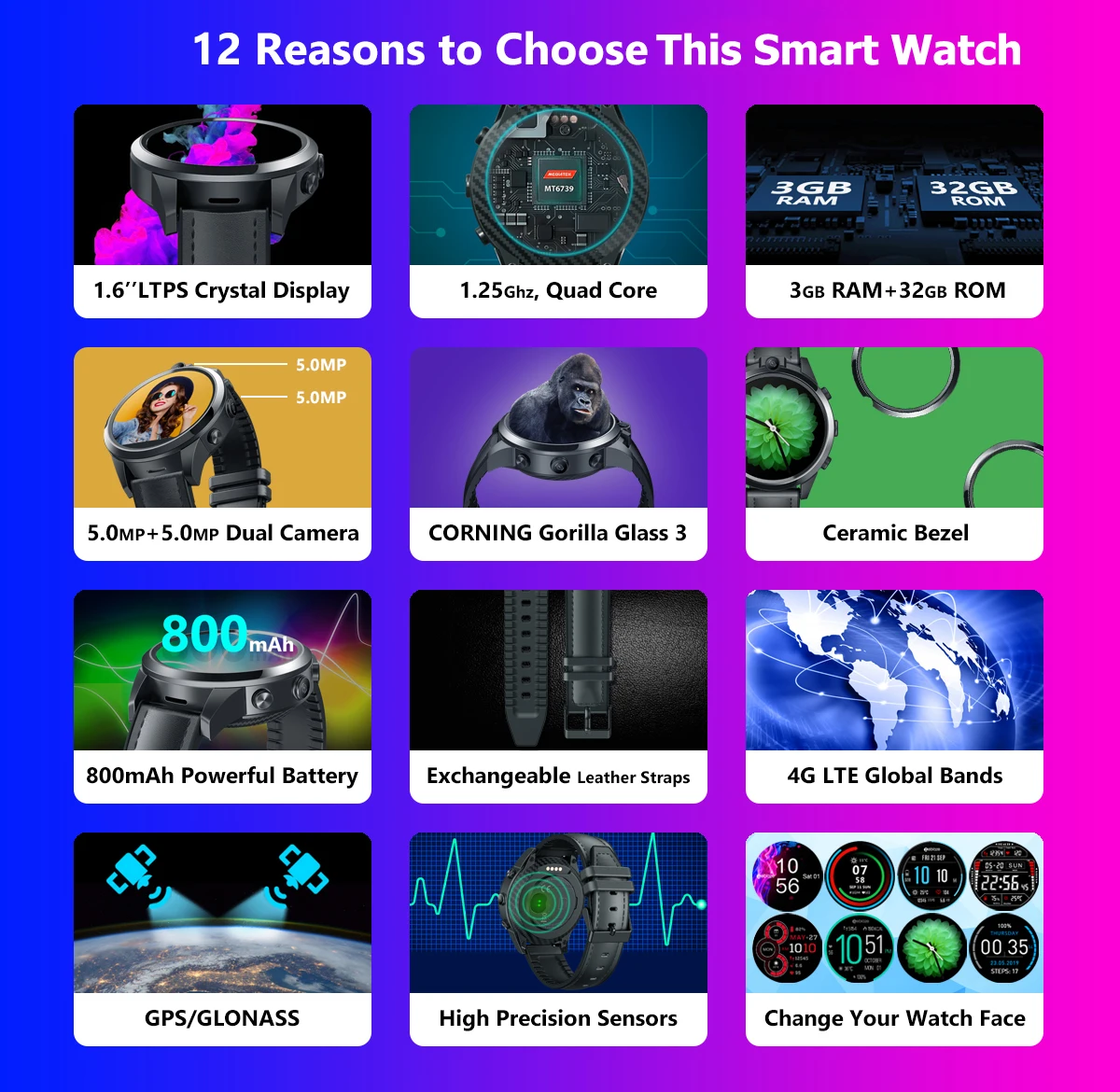 1, 1,6 ''LTPS Кристальный дисплей2, 1,25 ГГц, четырехъядерный3, 3 Гб RAM + 32 ГБ ROM4, двойная камера 5.0MP + 5.0MP5, CORNING Gorilla Glass 36, керамический ободок7, 800 мАч мощный аккумулятор8. Сменные кожаные ремни9, 4G LTE Global Bands10, GPS/ГЛОНАСС11, высокоточные датчики12, меняйте циферблат часов