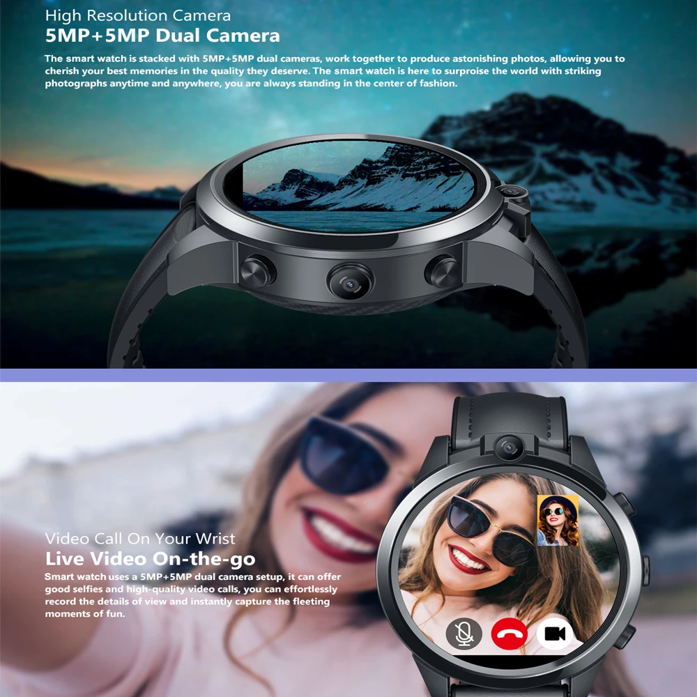 1, камера высокого разрешения 5 Мп + 5 Мп двойная камераУмные часы с двумя камерами 5 Мп + 5 МП, работают вместе, чтобы создавать удивительные фотографии, позволяя вам ценить ваши лучшие воспоминания по качеству, которого они заслуживают. Умные часы здесь, чтобы удивить мир яркими фотографиями в любое время и в любом месте, вы всегда стоите в центре моды.2. Видеозвонок на запястье в режиме реального времениУмные часы используют двойную настройку камеры 5 Мп + 5 МП, они могут предложить хорошие селфи и высококачественные видеозвонки, вы можете легко записывать детали просмотра и мгновенно запечатлеть мимолетные моменты веселья.