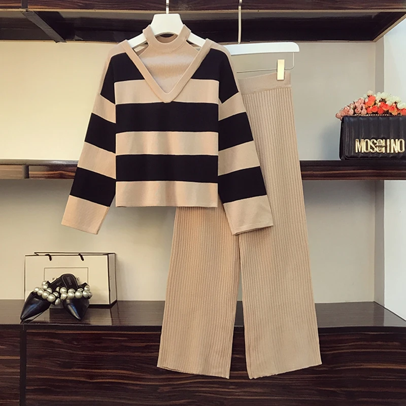 Костюм женский в полоску, пикантный свитер с лямкой на шее и широкие брюки, костюм из двух предметов, весна-осень
