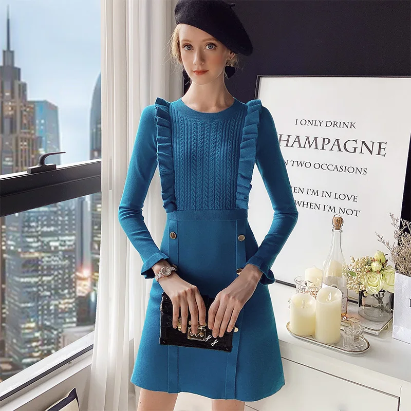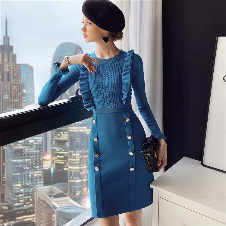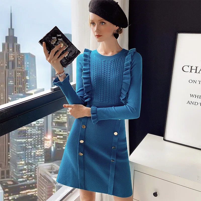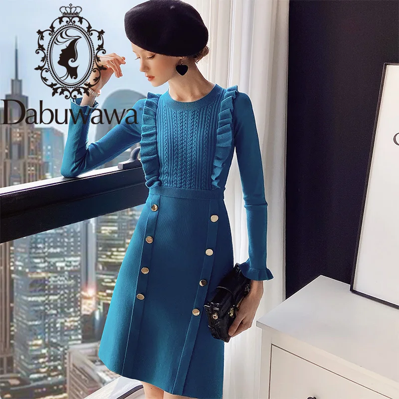 Женское трикотажное платье Dabuwawa, теплое двубортное однотонное платье с оборками и круглым вырезом, с длинным рукавом, на осень и зиму, DT1DDR005