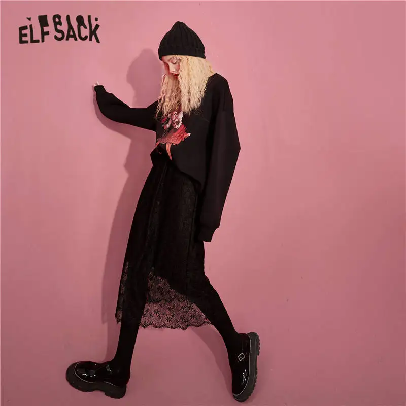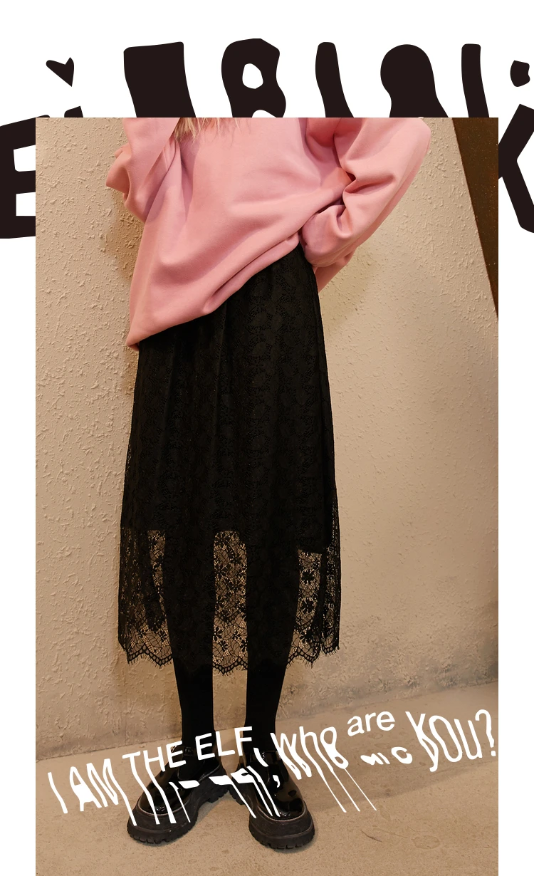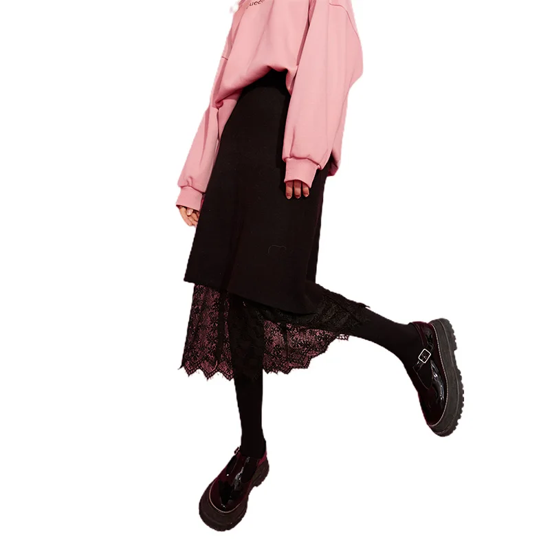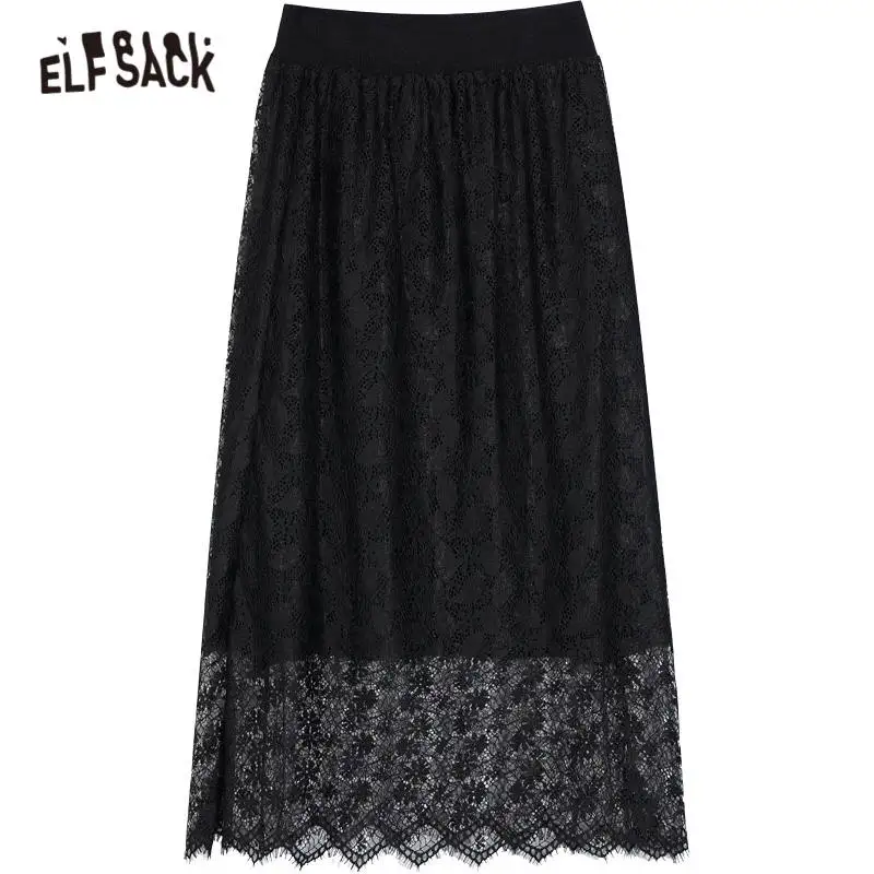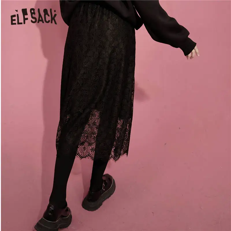 ELFSACK однотонные контрастные кружевные повседневные трикотажные женские миди юбки, осень 2020, винтажная Высокая талия ELF, Корейская Дамская Базовая Повседневная Нижняя часть
