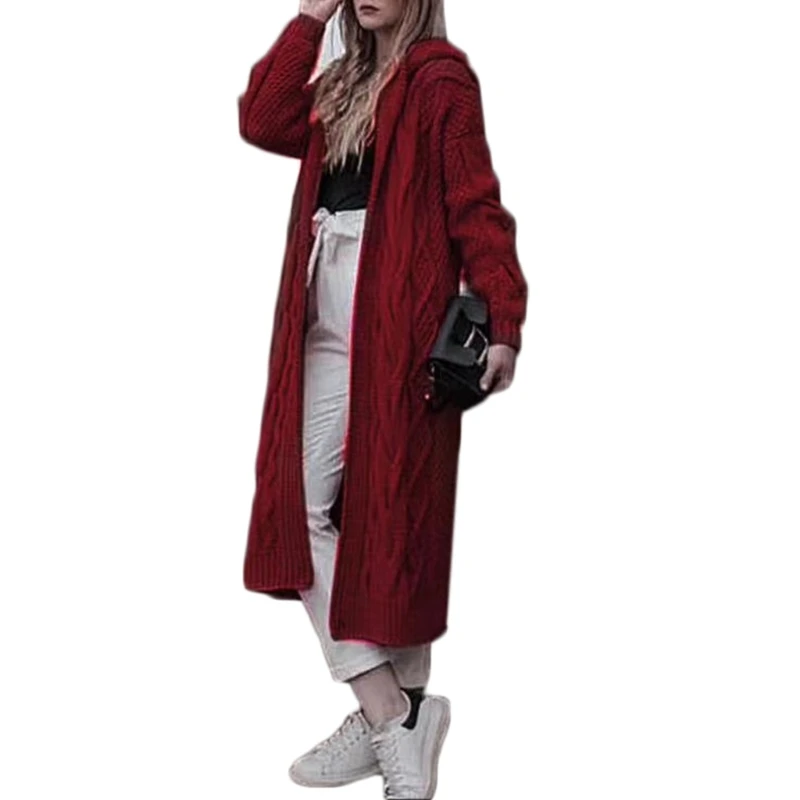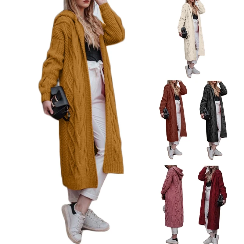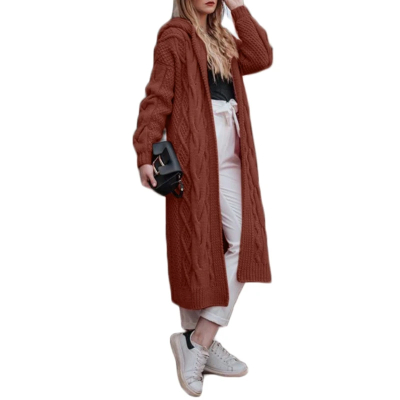 Женский кардиган с капюшоном, длинный однотонный вязаный косичкой