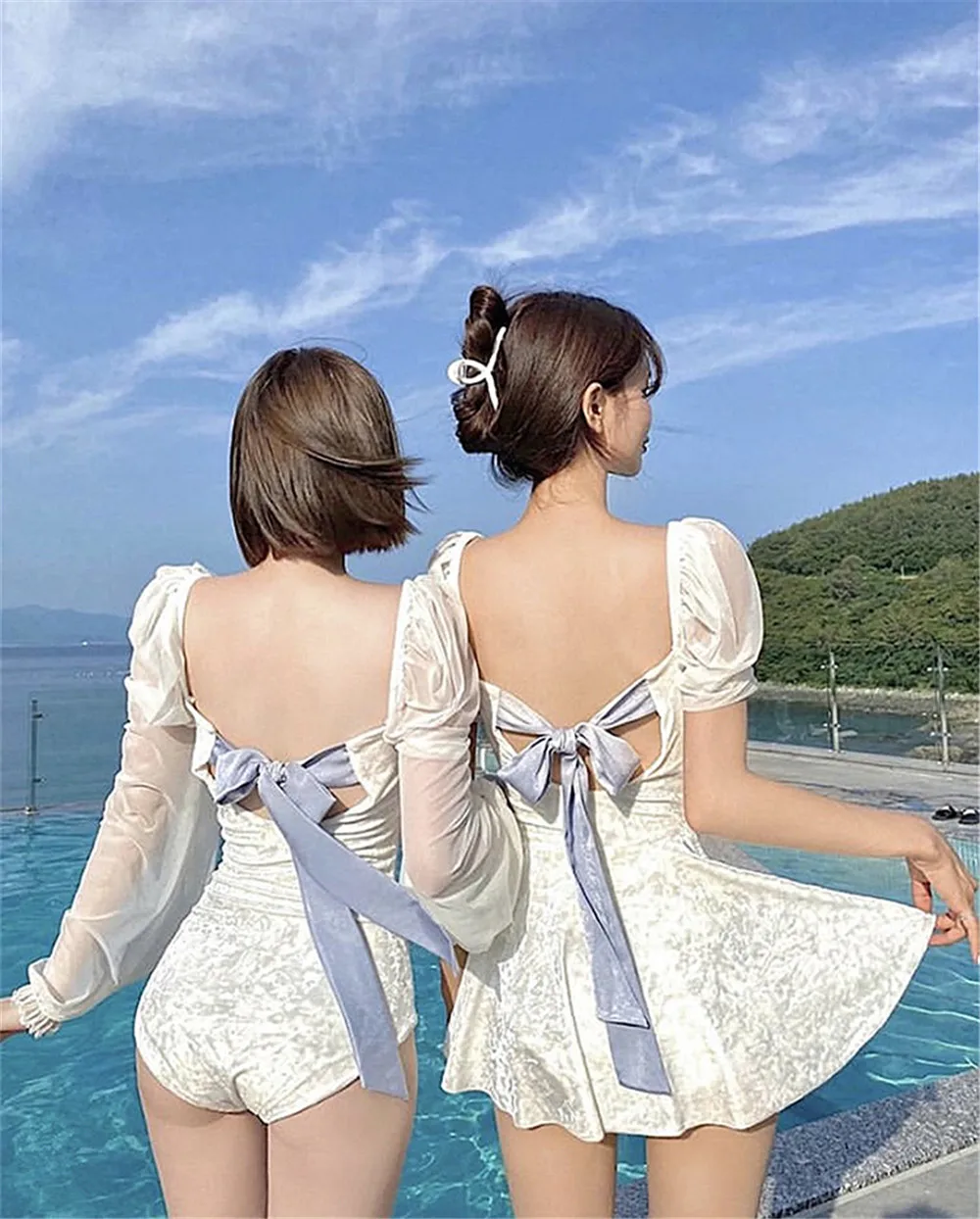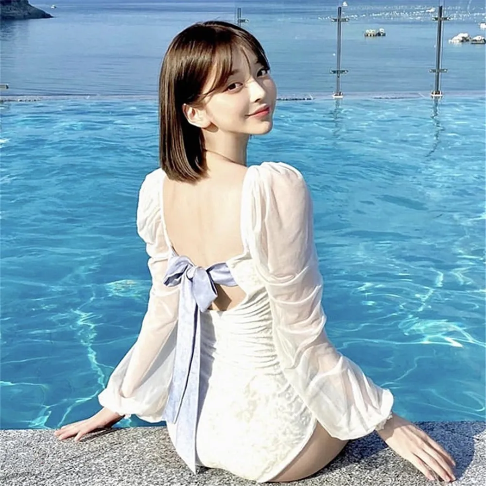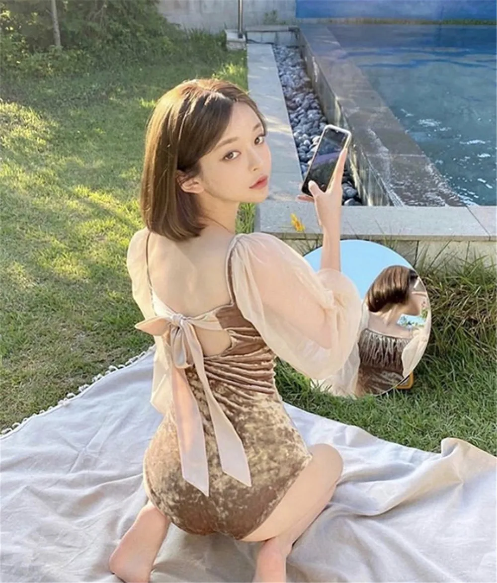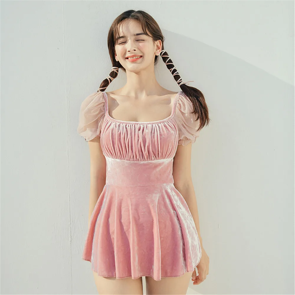 Бархатный Цельный купальник, Женский однотонный купальник, монокини с длинным рукавом, купальник пуш-ап, корейский сетчатый купальный костюм, юбка с подкладками и поясом