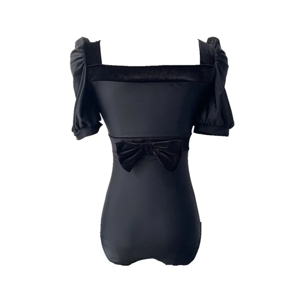 Слитный купальник с коротким рукавом, Женский однотонный черный куп...