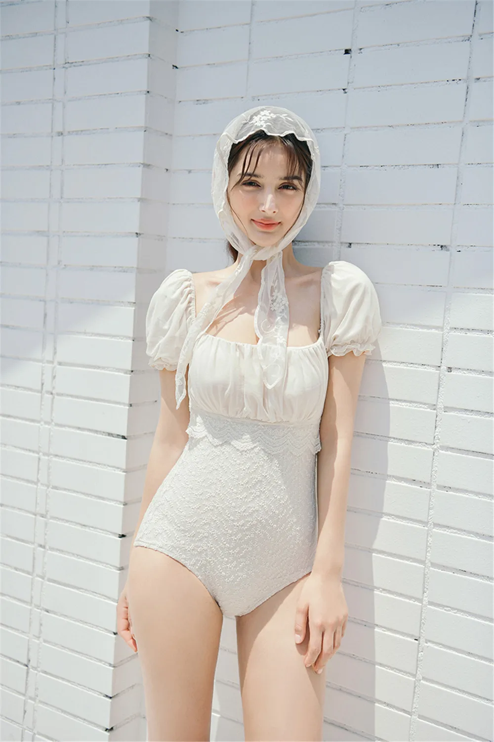 Слитный купальный костюм с коротким рукавом, Женский однотонный купальник, кружевной Монокини, купальник пуш-ап, корейский купальный костюм с подкладкой, плиссированная вышивка