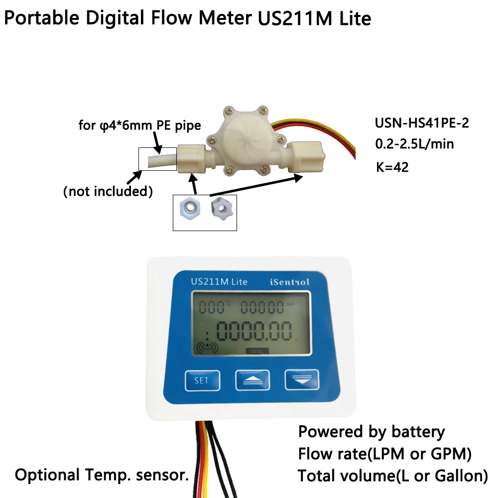 US211M Lite цифровой расходомер и USN-HS41PE-2 0,2-2.5LPM датчик общего объема и расхода