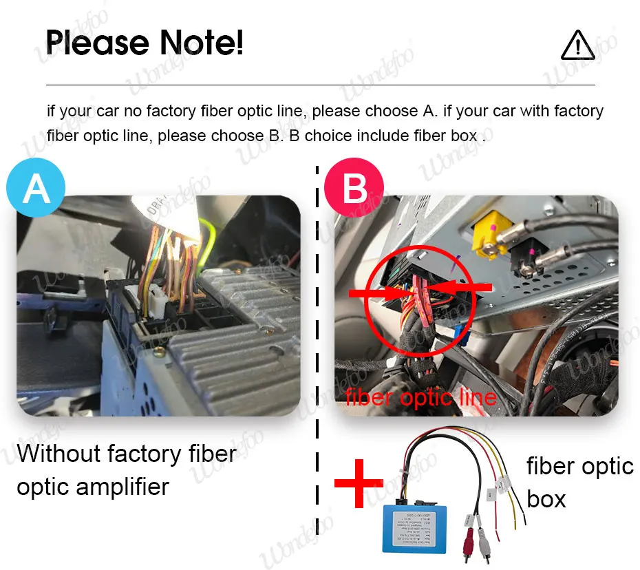 Если у вашего автомобиля нет заводской оптоволоконной линии, пожалуйста, выберите A.Если ваш автомобиль с фабричной оптоволоконной линией, пожалуйста, выберите B. B выбор включает коробку из волокна.