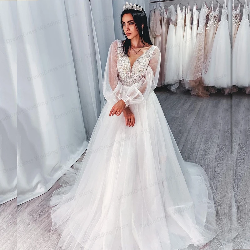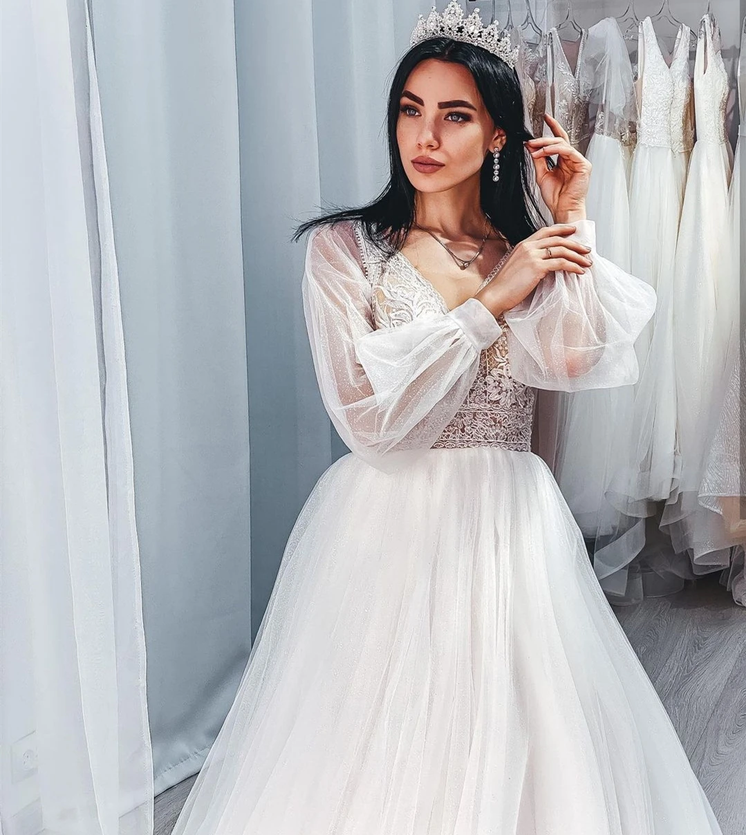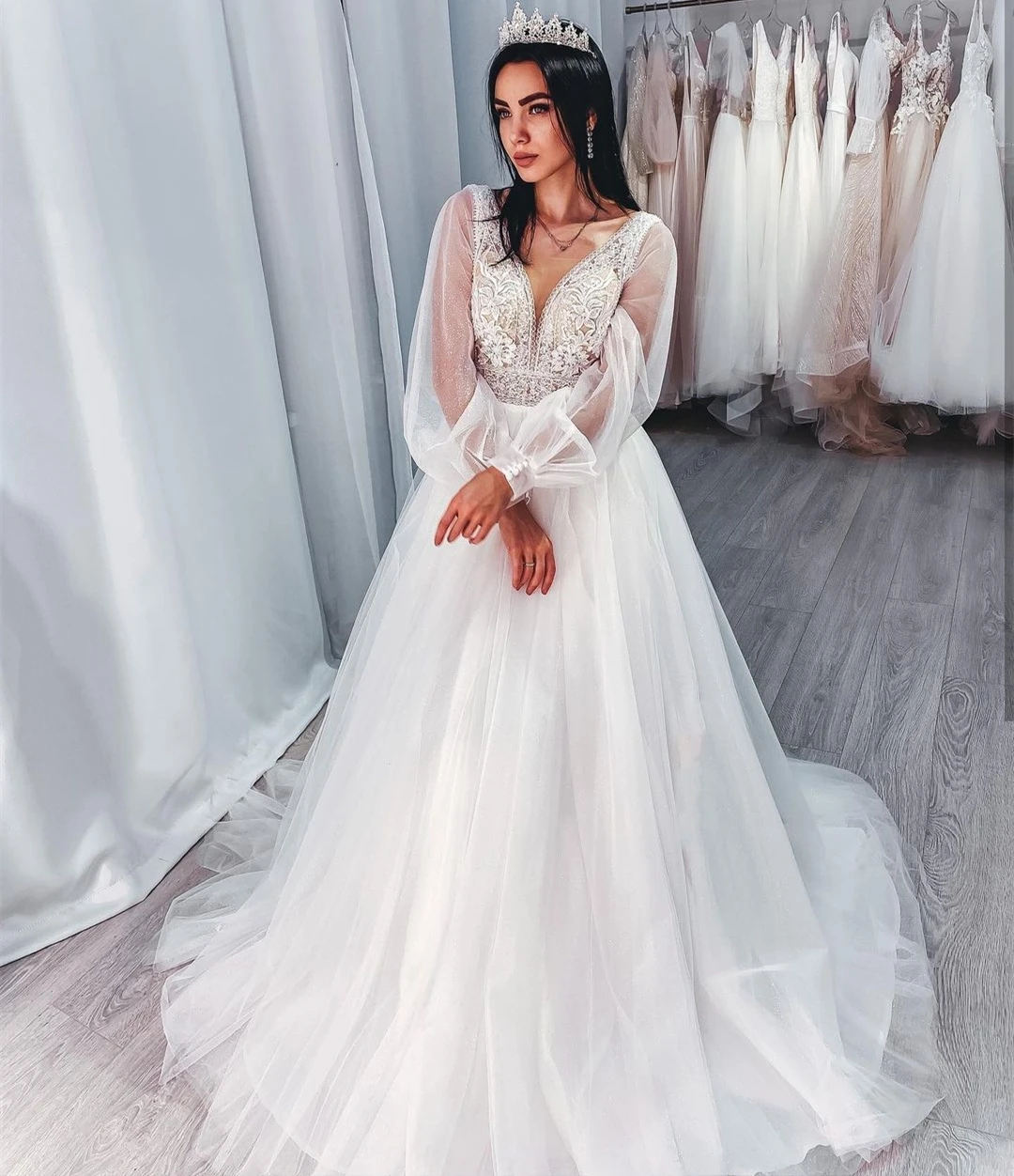 Женское свадебное платье до пола, ТРАПЕЦИЕВИДНОЕ ПЛАТЬЕ С Длинным Рукавом, кружевной аппликацией и белым подолом, элегантное платье невесты, 2021