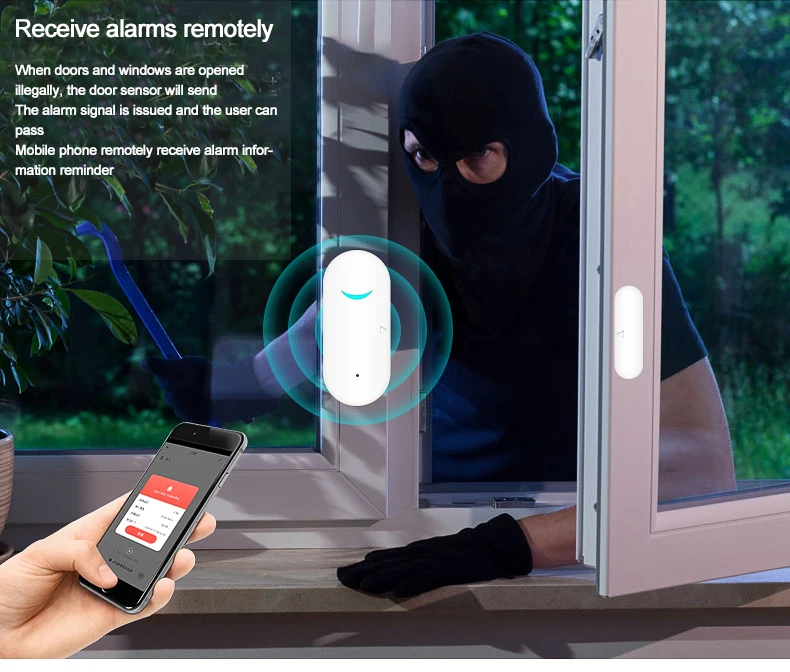 При незаконном открытии дверей или окон детектор двери отправит сигнал тревоги в режиме реального времени, и пользователь может использовать мобильный телефон для удаленного получения информации о тревоге.