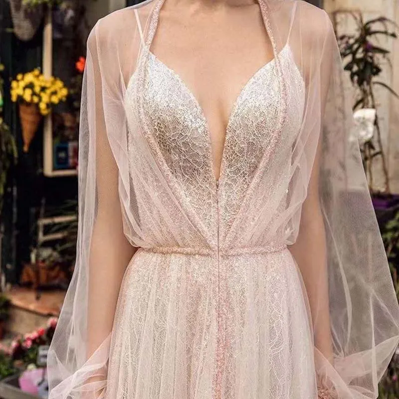 Длинное кружевное платье невесты, из легкого тюля, цвета шампанского