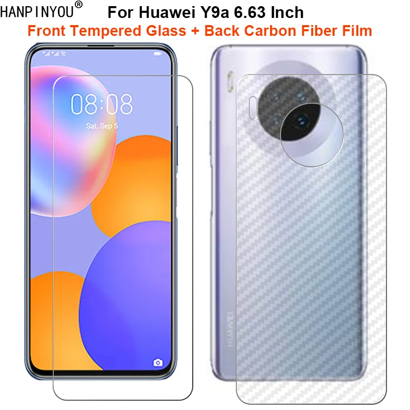 1 комплект = мягкая задняя пленка из углеродного волокна для Huawei Y9a 6,63 дюйма + ультратонкое прозрачное закаленное стекло для переднего экрана